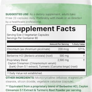 - Each bottle includes 240 vegetarian capsules, featuring a 4-in-1 combination of berberine HCl root, chromium picolinate, ceylon cinnamon 5:1 bark extract, and turmeric root*