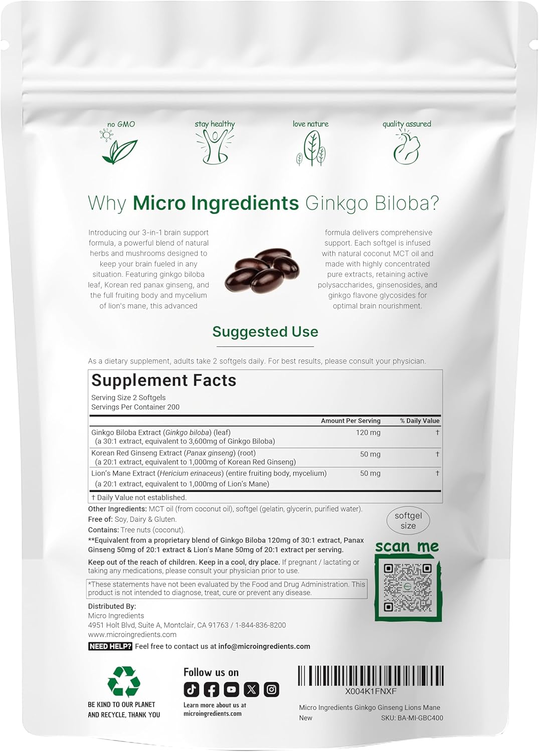- Micro Ingredients offers a highly concentrated 3-in-1 brain support softgel formula featuring ginkgo biloba, Korean red panax ginseng, and full-spectrum lion’s mane mushroom fruiting body and mycelium extracts.