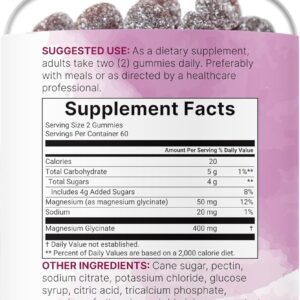 - Each bottle includes 120 chewable gummies made with chelated magnesium glycinate for superior absorption and digestive comfort. A two-gummy serving provides a 400mg dose for consistent daily replenishment.