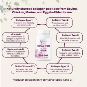 - A powerful formula that contains collagen types I, II, III, V, and X. Take it with any of your favorite drinks and replenish your body with top grade collagen from natural sources including bovine, chicken, marine, and eggshell membrane.