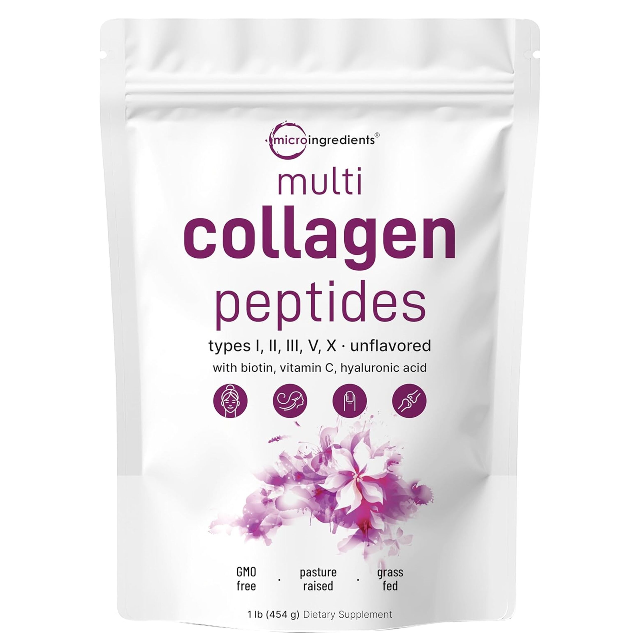 Micro Ingredients Multi Collagen Protein Powder, 1lb – Type I,II,III,V,X with Biotin, Hyaluronic Acid, Vitamin C – Unflavored Collagen Peptides – 1lb- 41 SERVINGS