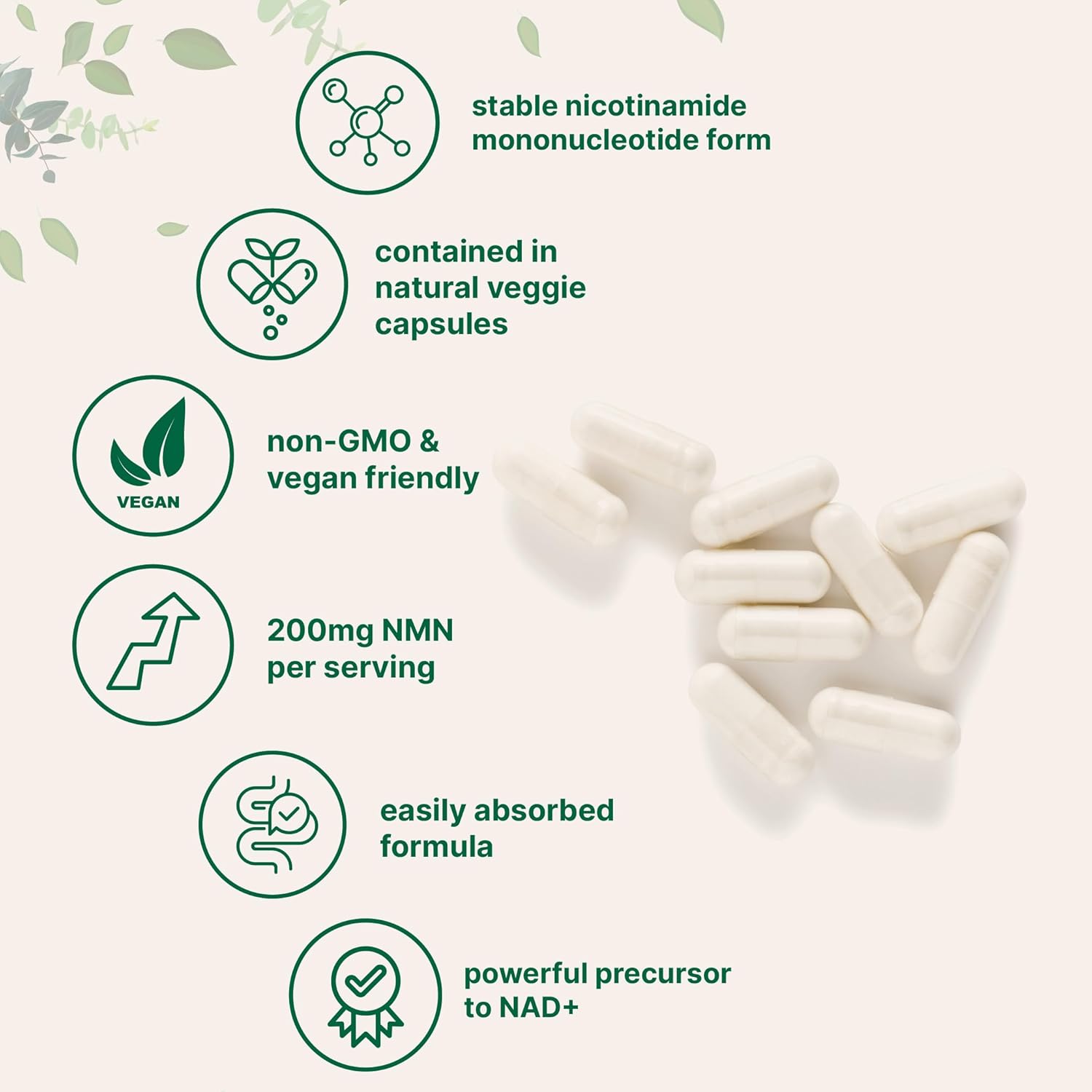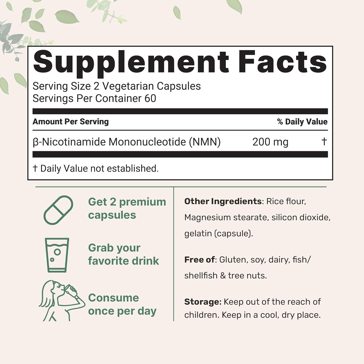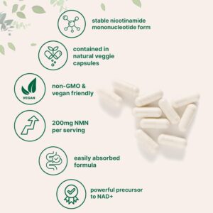 - Each bottle contains 120 natural vegetarian capsules, providing 60 servings and delivering 200mg of nicotinamide mononucleotide per serving.