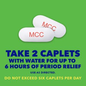 • FOR EFFECTIVE PERIOD PAIN RELIEF: Take two caplets with water every six hours and repeat as necessary without exceeding six caplets per day