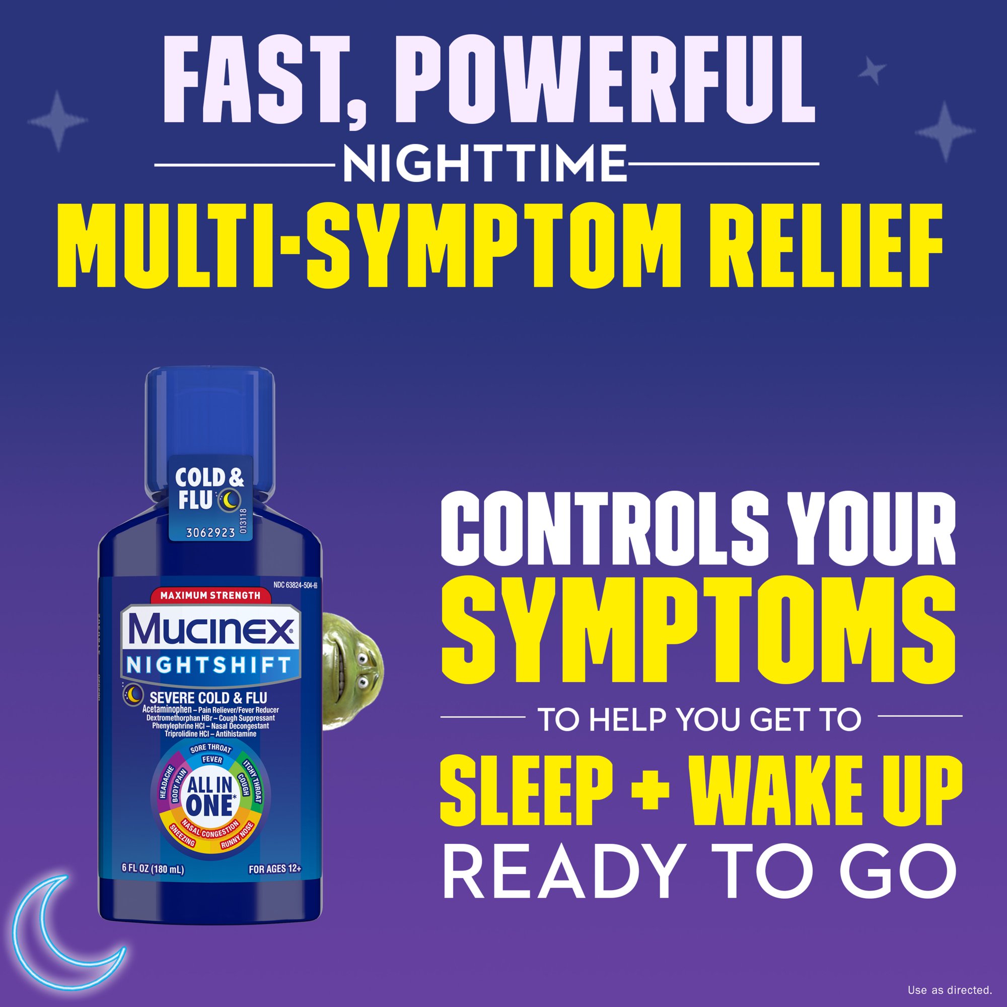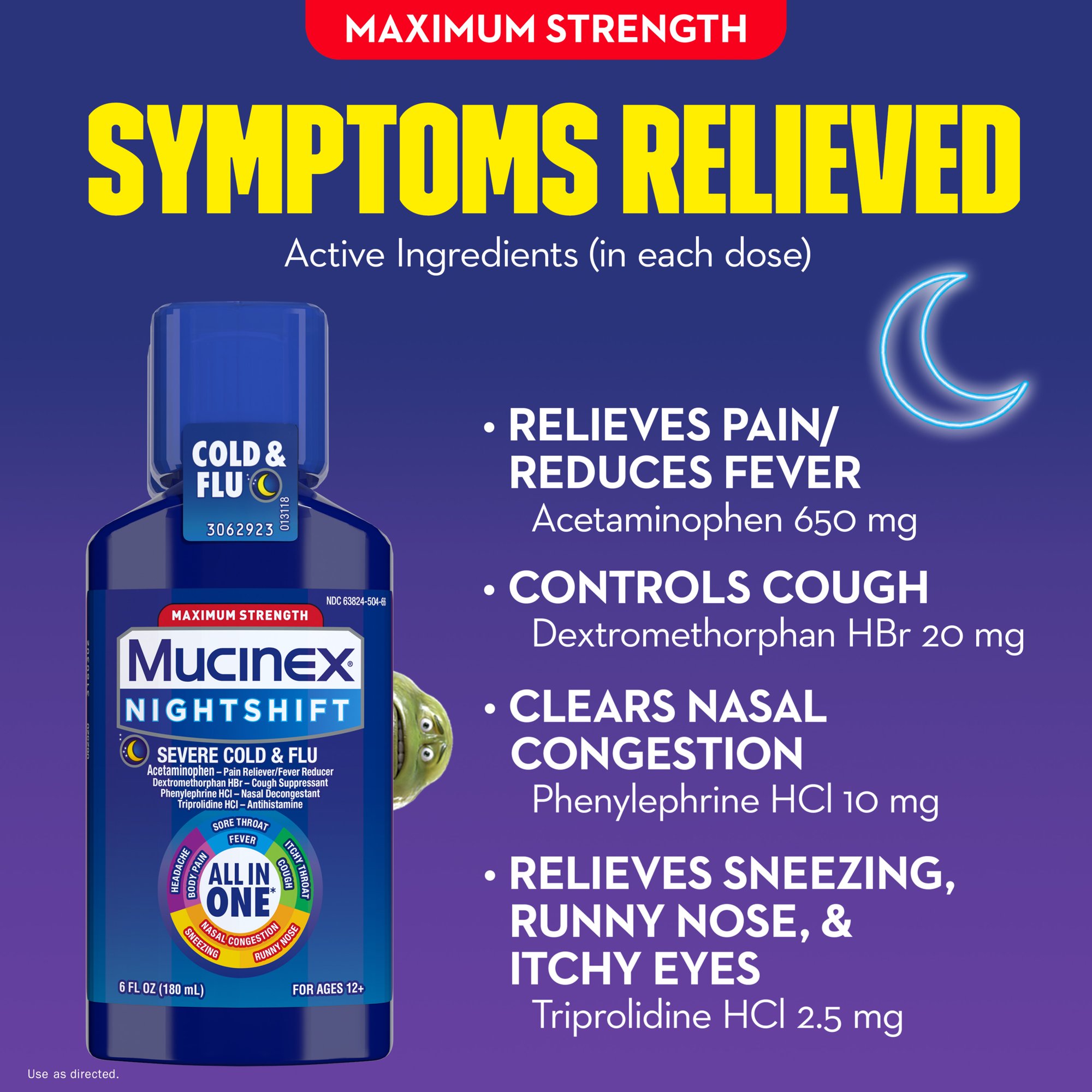 - COLD & FLU RELIEF: Maximum Strength Mucinex Nightshift Severe Cold & Flu helps reduce fever, relieve pain, headache, cough, nasal congestion, runny nose, sneezing and sore throat