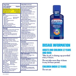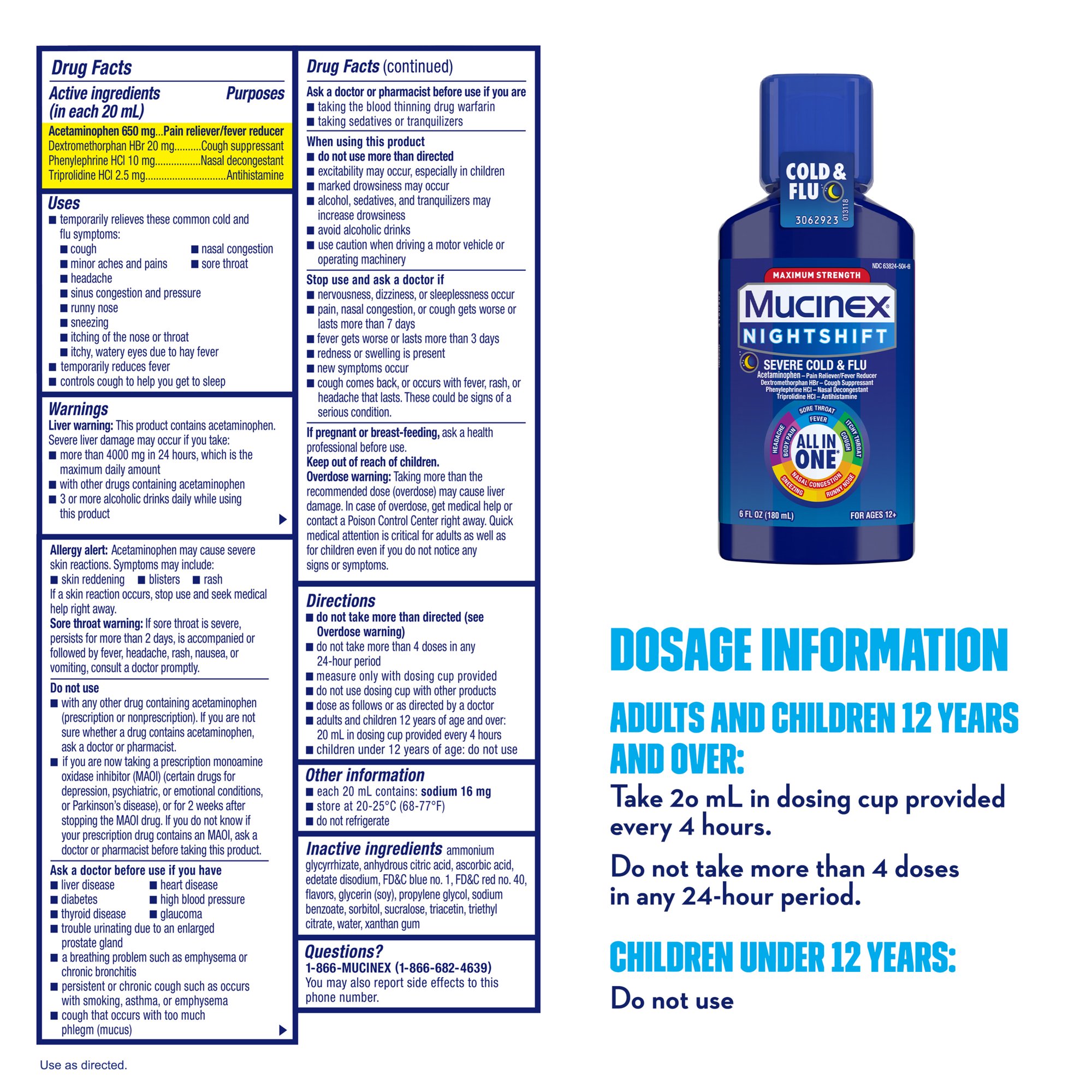 Maximum Strength Mucinex Nightshift Severe Cold & Flu is a Night time Multi-Symptom Relief medicine for your Cold & Flu Symptoms. Maximum Strength Mucinex Nightshift Severe Cold & Flu helps reduce fever, relieve pain, headache, cough, nasal congestion, runny nose, sneezing and sore throat. Mucinex is the #1 Cough & Cold Brand Doctors Trust* and #1 Pharmacist Recommended Brand†. This product contains 6 Fluid Ounces. Use as directed, for Adults and Children 12 years of age and over.SYMPTOMS RELIEVED: Maximum Strength Mucinex Nightshift Severe Cold & Flu helps reduce fever, relieve pain, headache, cough, nasal congestion, runny nose, sneezing and sore throatACTIVE INGREDIENTS: Contains Acetaminophen – pain reliever/fever reducer/fever reducer; Dextromethorphan HBr – cough suppressant; Phenylephrine HCI – nasal decongestant; Triprolidine HCl – Antihistamine to alleviate sneezing, runny and itchy nose and watery eyesTake only as Directed