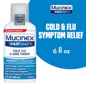 - MAXIMUM STRENGTH RELIEF: Maximum Strength Mucinex Fast-Max Cold, Flu & Sore Throat helps reduce fever, relieve cough, sore throat, stuffy nose, chest & nasal congestion, headache and minor aches and pains