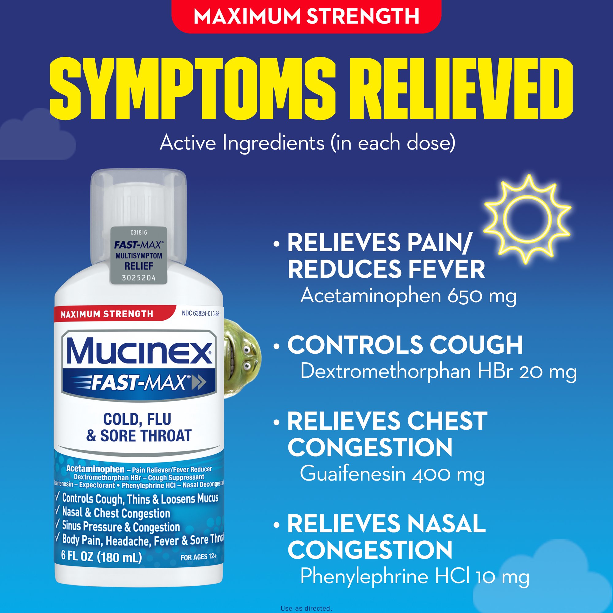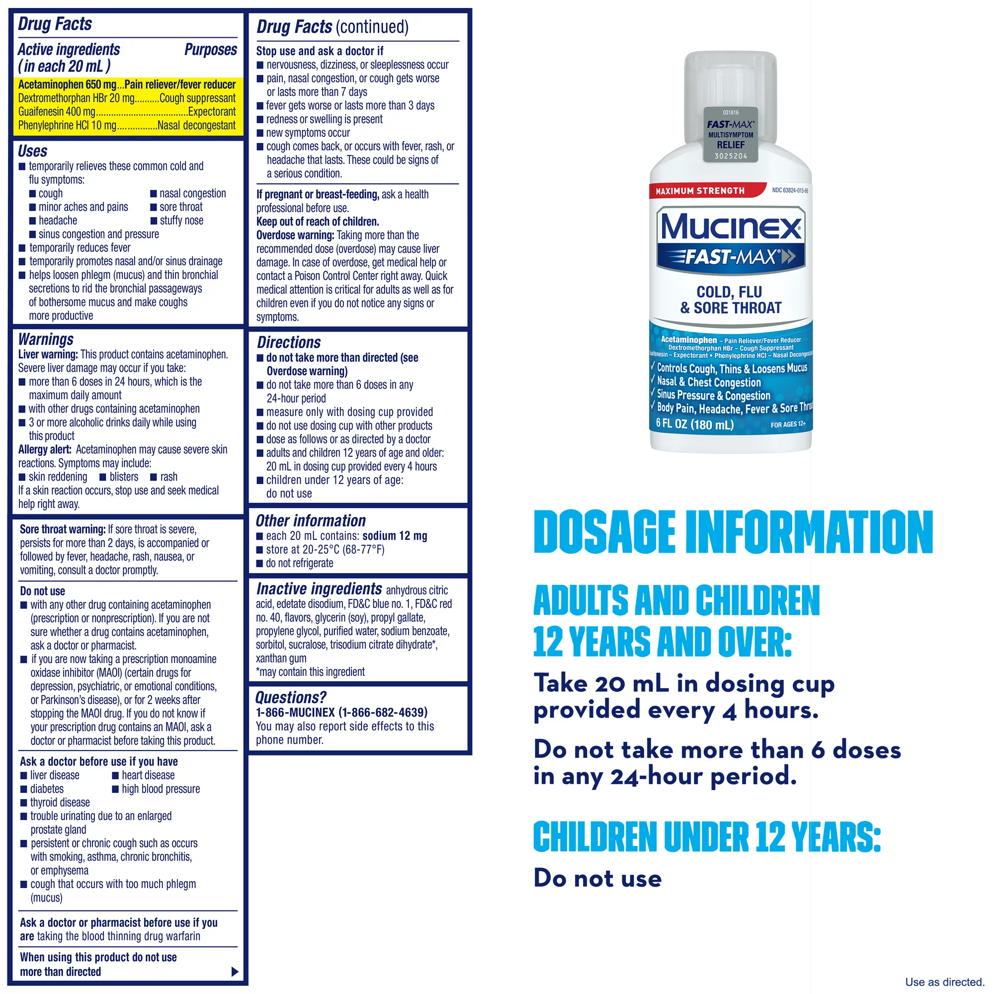 Maximum Strength Mucinex Fast-Max Cold, Flu & Sore Throat is a Multi-Symptom Relief medicine for your Cold & Flu Symptoms. Maximum Strength Mucinex Fast-Max Cold, Flu & Sore Throat helps helps reduce fever, relieve cough, sore throat, stuffy nose, chest & nasal congestion, headache and minor aches and pains. Mucinex is the #1 Cough & Cold Brand Doctors Trust* and #1 Pharmacist Recommended Brand†. This product contains 6 Fluid Ounces. Use as directed, for Adults and Children 12 years of age and over.SYMPTOMS RELIEVED: Maximum Strength Mucinex Fast-Max Cold, Flu & Sore Throat helps reduce fever, relieve cough, sore throat, stuffy nose, chest & nasal congestion, headache and minor aches and painsACTIVE INGREDIENTS: Contains Acetaminophen – pain reliever/fever reducer; Dextromethorphan HBr – cough suppressant