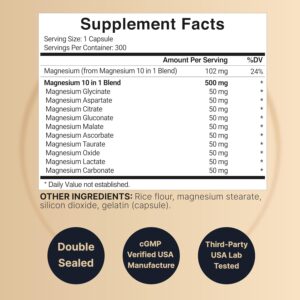 - 10 in 1 active magnesium complex, 500mg per serving, bulk 300 capsule supply, convenient one a day formula, lasts up to 10 months.