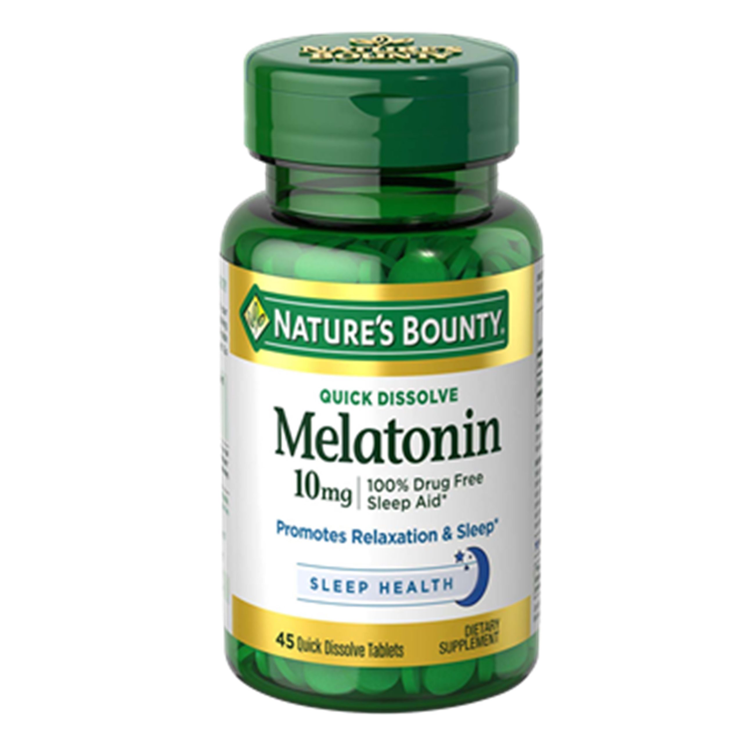 Melatonin by Nature’s Bounty, 100% Drug Free Sleep Aid, Dietary Supplement, Promotes Relaxation and Sleep Health, 10mg, 45 Quick Dissolve Tablets