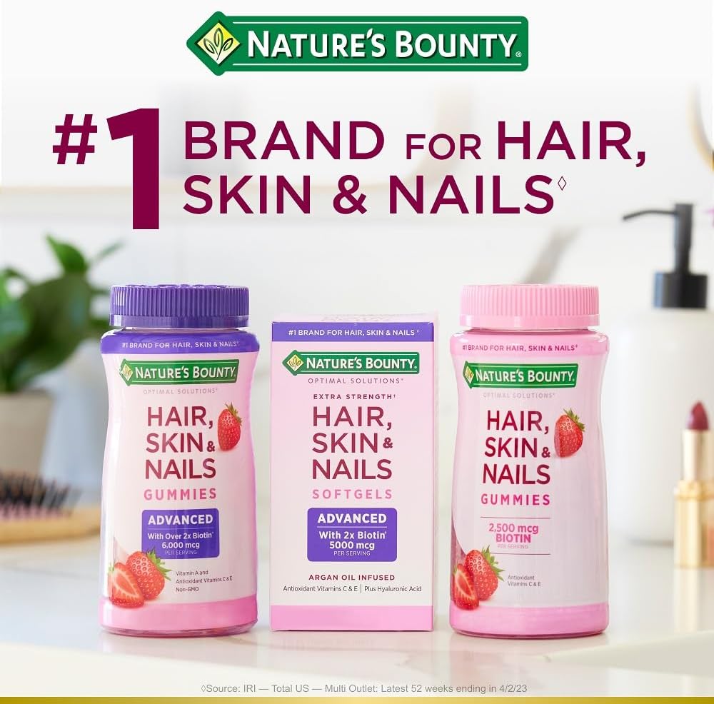Ready to shine from the inside out? (1) Support your natural beauty with Nature’s Bounty Hair, Skin & Nail supplements. (1) From advanced softgels to delicious gummies and jelly beans, our wide range of products are designed to fit your lifestyle needs, whatever they may be. Each innovative formula is packed with Biotin and antioxidant vitamins C & E for beauty support. (1) Nature’s Bounty Hair, Skin & Nails Advanced Softgels are infused with argan oil and contain 5,000 mcg of biotin per serving, plus hyaluronic acid, a popular beauty ingredient. (1) Our Hair, Skin & Nails Gummies and Advanced Gummies are both bursting with delicious strawberry flavor and contain 2,500 mcg and 6,000 mcg of Biotin per serving, while our mixed berry Jelly Beans contain 6,000 mcg of Biotin plus Keratin. (1) Whether you decide to mix and match or stick with your favorite supplement, all of Nature’s Bounty Hair, Skin & Nails vitamins support your natural beauty from within. (1)