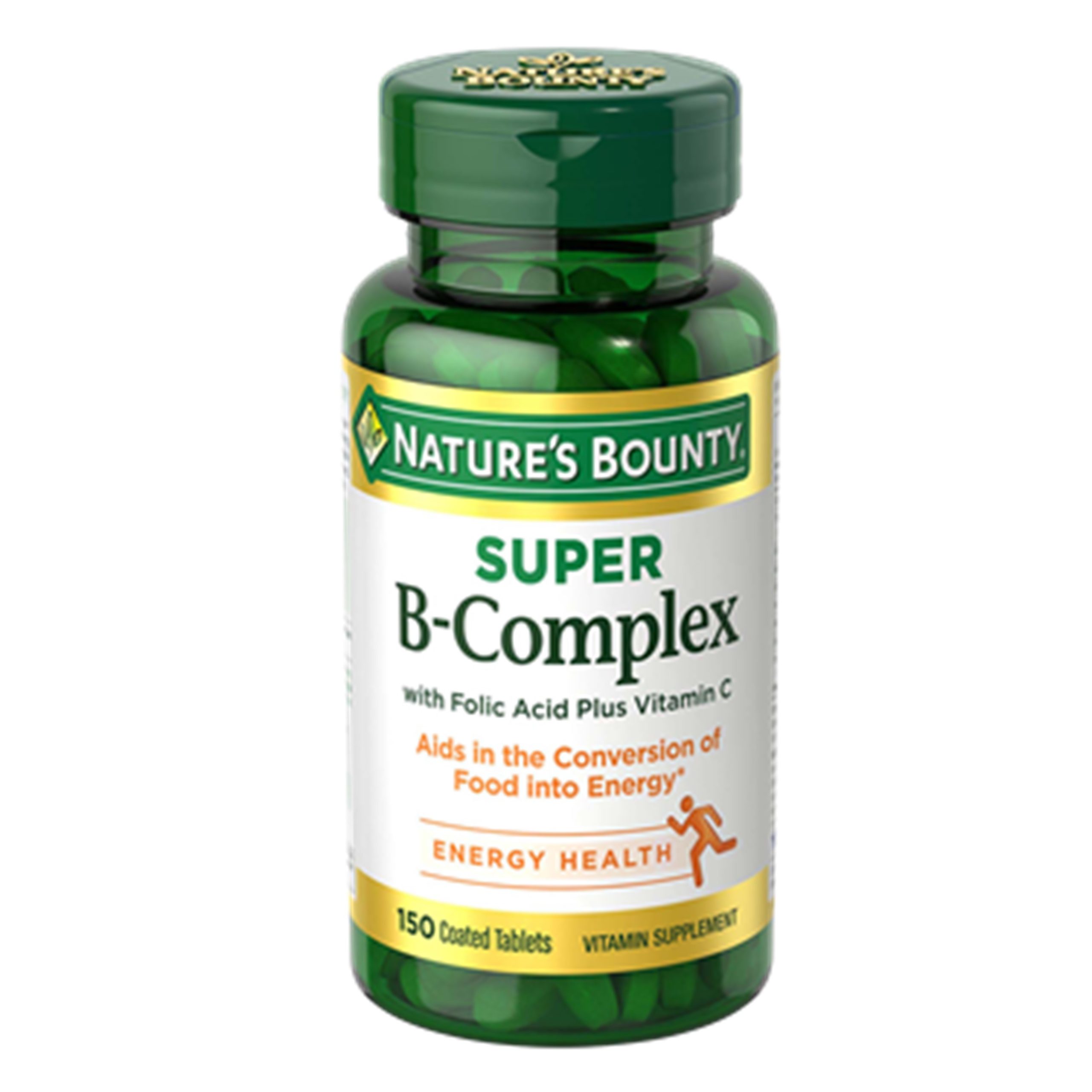 - FOR ENERGY 150-count Coated Tablets, Nature’s Bounty Super B-Complex with Folic Acid Plus Vitamin C. Plays an important role in energy metabolism in the body*. Helps the body convert food into the fuel which is used to maintain energy.*