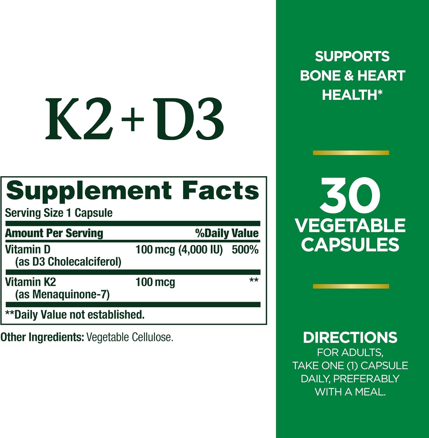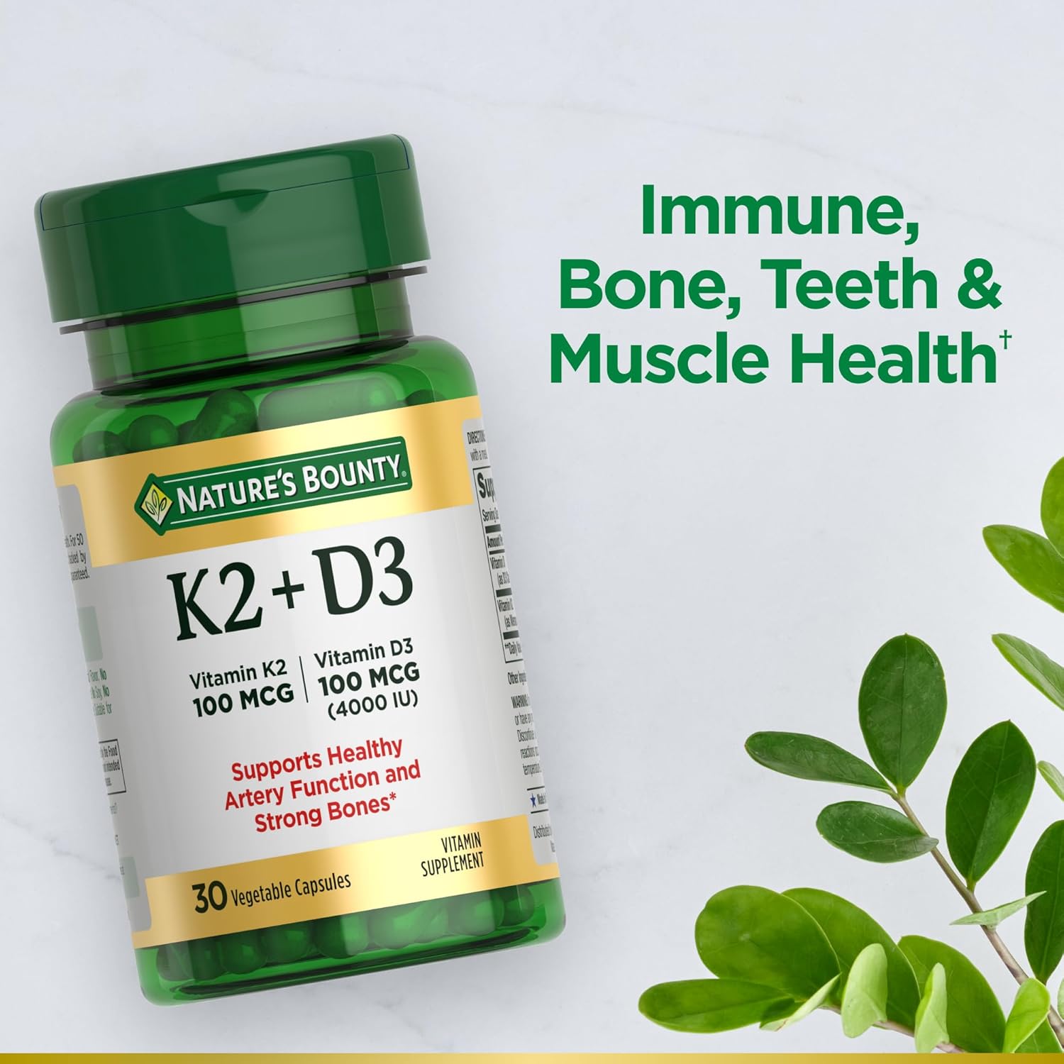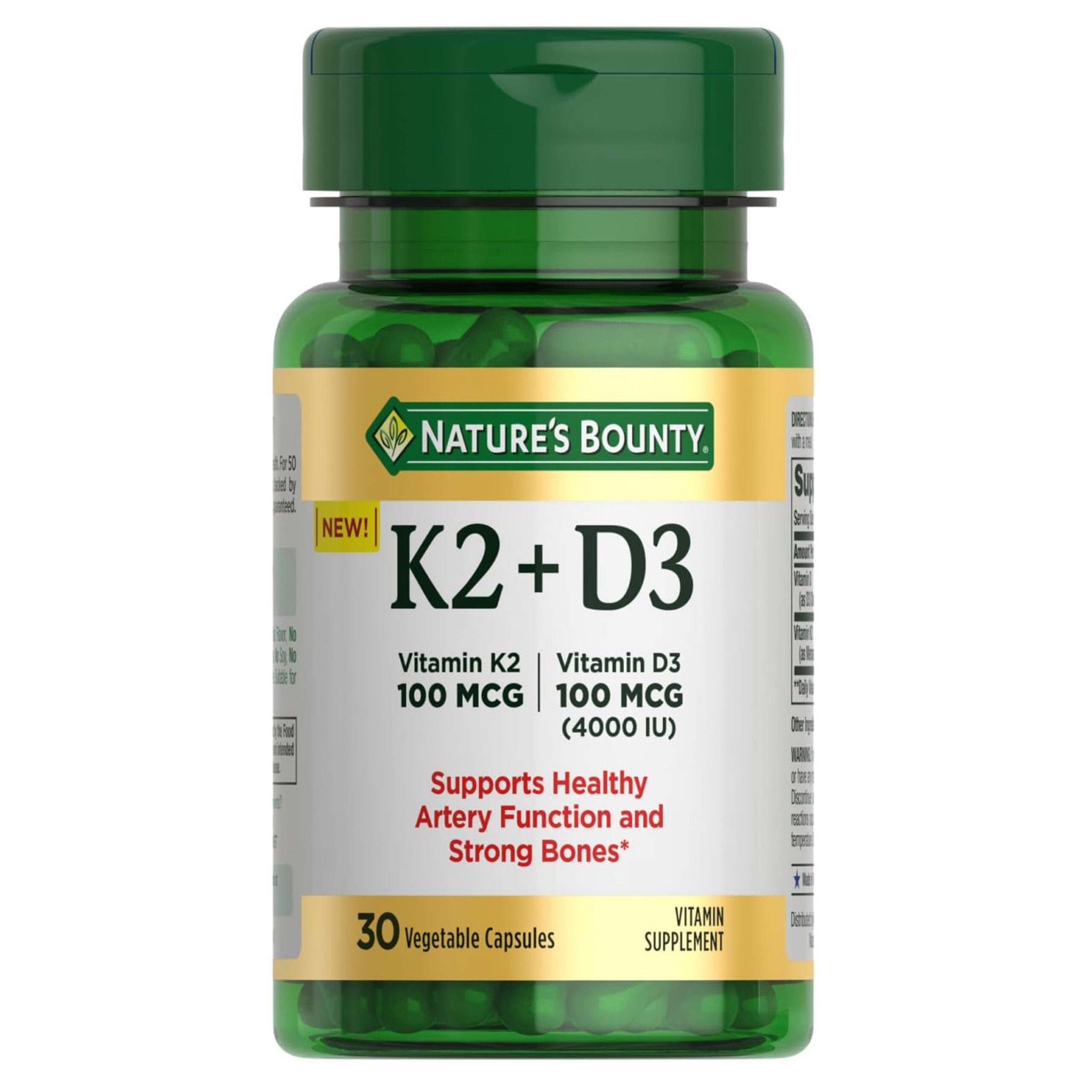 Your wellness journey starts at the bone with Nature’s Bounty Vitamin K2 + D3! Feel confident in your health journey knowing you’re getting the power of both D3 and K2 Vitamins. (1) Vitamin D3 is an essential nutrient that supports bone, teeth, muscle, and immune health. (1) While Vitamin K2 supports the function of D3 by activating calcium absorption for strong bones. (1) Best of all, you’ll feel more vibrant each day thanks to Vitamin D3 giving your body year-round immune support! (1) This supplement contains the same form of vitamin D produced in the body from direct sunlight exposure. (1) You won’t find any artificial flavors in this supplement either, plus they are gluten-free and free of synthetic dyes. Like all Nature’s Bounty products, our Vitamin D3 and K2 supplement is backed by 50 years of quality, science, and great ingredients—guaranteed. Each bottle of Vitamin D3 and K2 supplements contains 30 capsules.