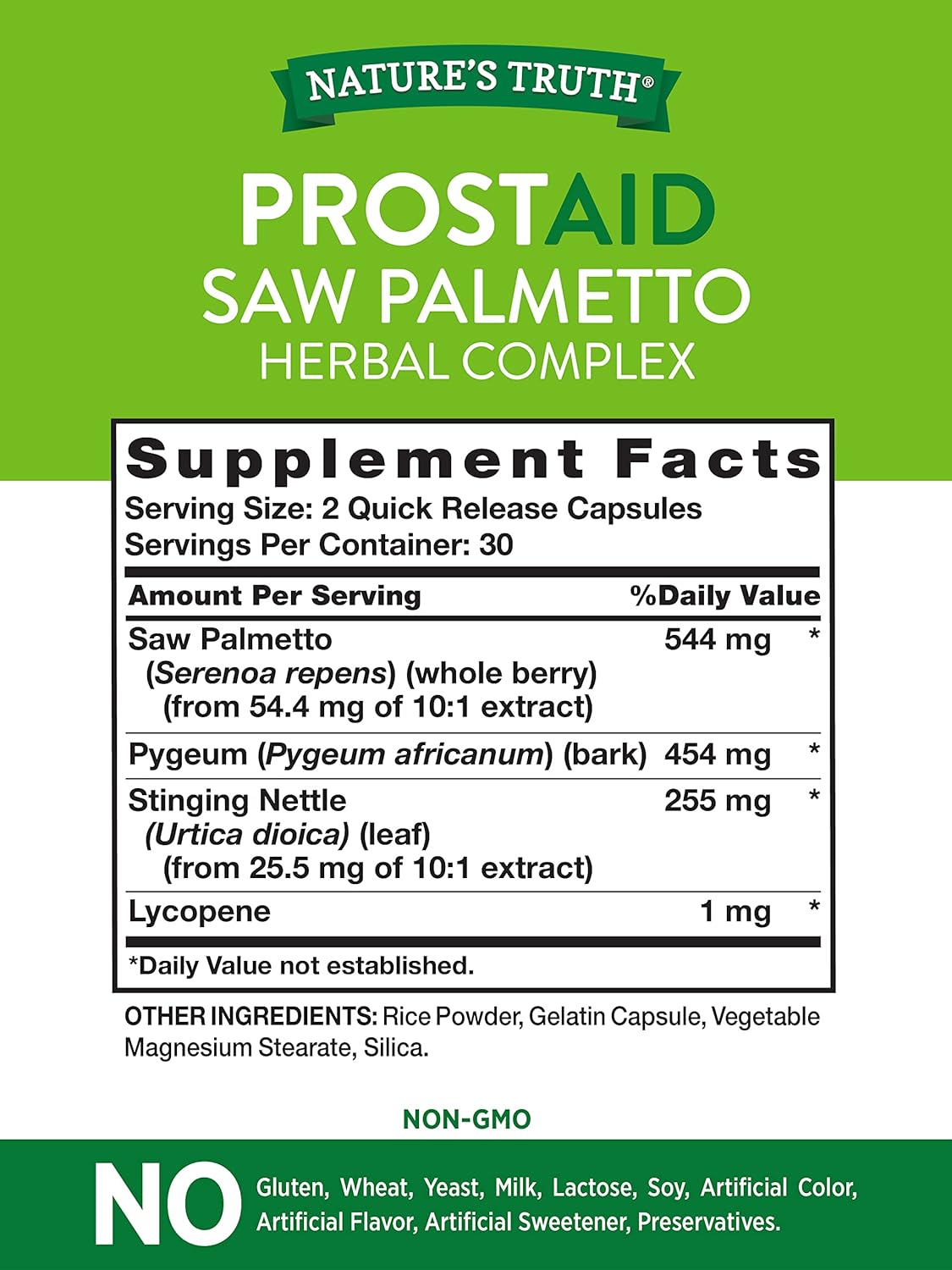 Nature’s Truth now carries a maximum support formula with all 3 of these dynamic herbs!* Our advanced, Extra-Strength, Prostaid Herbal Complex is stacked with a balanced spectrum of herbs with potent plant properties. Our unique formula offers a combo of Saw Palmetto, Pygeum and Lycopene in fast absorbing Quick-Release Capsules. Nature’s Truth is the ultimate brand for herbal supplements and real ingredients from trusted sources. Add this elite formula to your routine today!