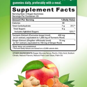 Each serving of our Turmeric Curcumin gummies delivers 450 mg of Turmeric Extract (a 3:1 extract, equivalent to 1,350 mg of Turmeric Root) and 75 mg of Ginger Extract (a 10:1 extract, equivalent to 750 mg of Ginger Root). Our vegan formula is also a delicious peach flavor!