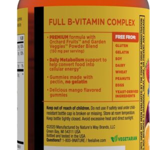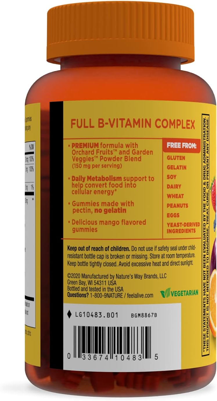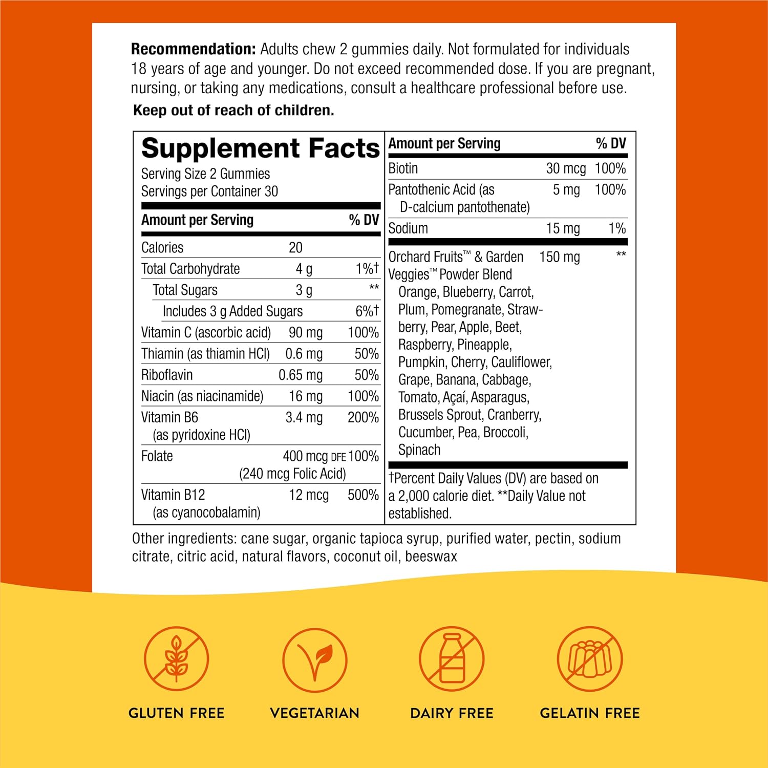 Daily gummies to support cellular energy with 8 B-vitamins.* Made with all 8 B-vitamins to help convert food into fuel.* With food-based Orchard Fruits & Garden Veggies powder blend (150 mg per serving). Delicious mango flavored gummies are made with pectin, not gelatin. Gluten-free and vegetarian. No soy, dairy, wheat, peanuts, eggs, or yeast-derived ingredients.