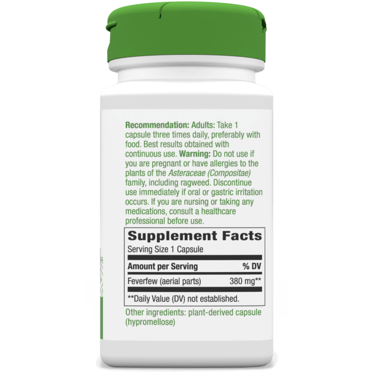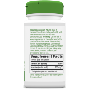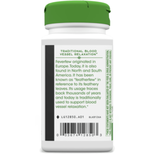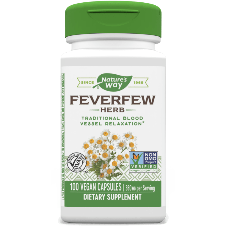 Feverfew is a flowering plant that originated in Europe but can now also be found in North and South America. It’s also known as “wild chamomile” and “featherfew,” due to its feathery leaves. Feverfew has been used for thousands of years. Today, Nature’s Way Feverfew is tradionally used to support blood vessel relaxation