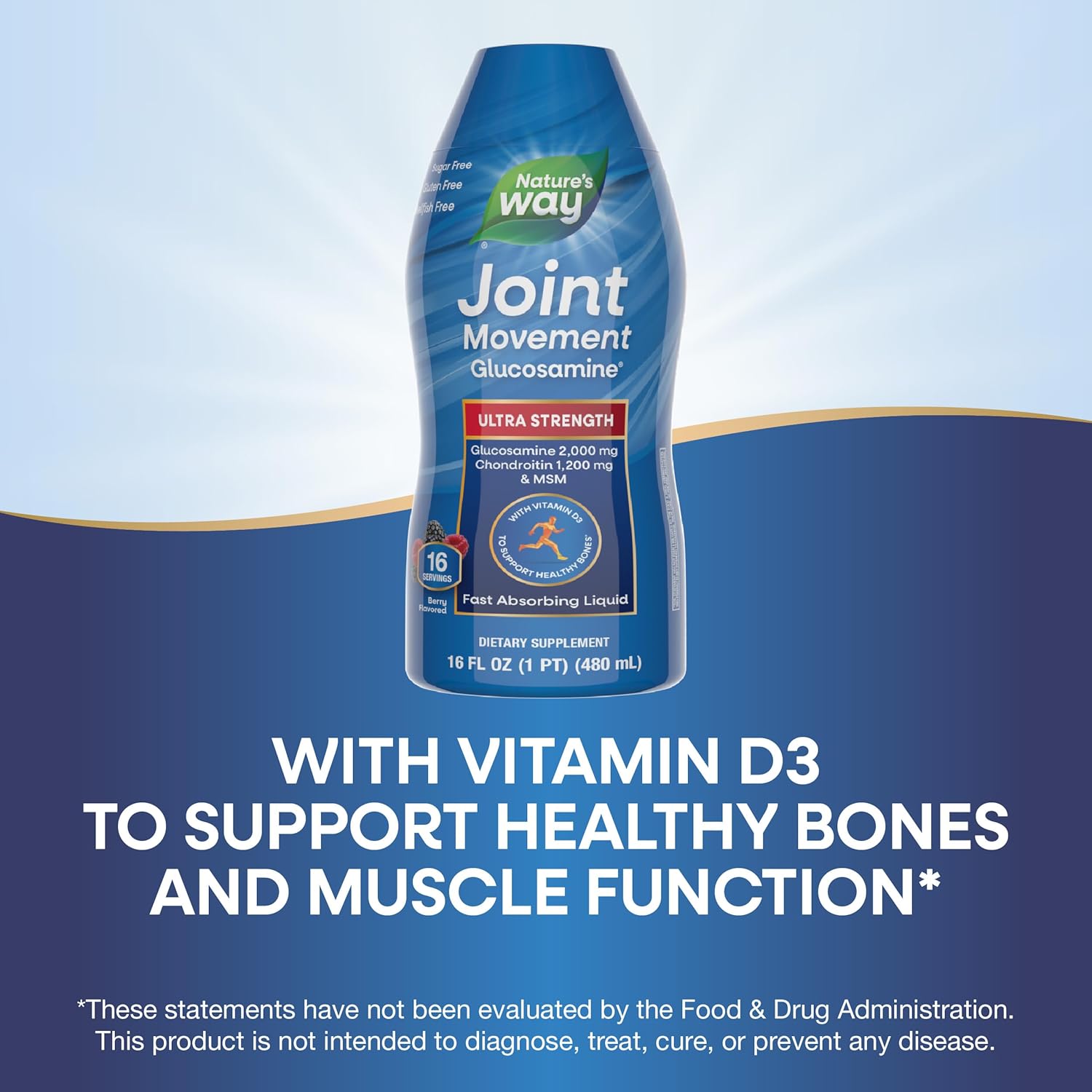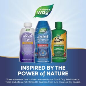 Nature’s Way Joint Movement Glucosamine is a fast absorbing berry-flavored liquid that provides 2,000mg of glucosamine, a building block of cartilage tissue; 1,200mg of chondroitin, a component of connective tissue; 500mg MSM, a source of sulfur and a mineral vital in the formation of collagen; 50% Daily Value vitamin D3 to help promote healthy bones and muscle function; and 10 mg of hyaluronic acid per 2-tablespoon serving.* *This statement has not been evaluated by the Food and Drug Administration. This product is not intended to diagnose, treat, cure, or prevent any disease.