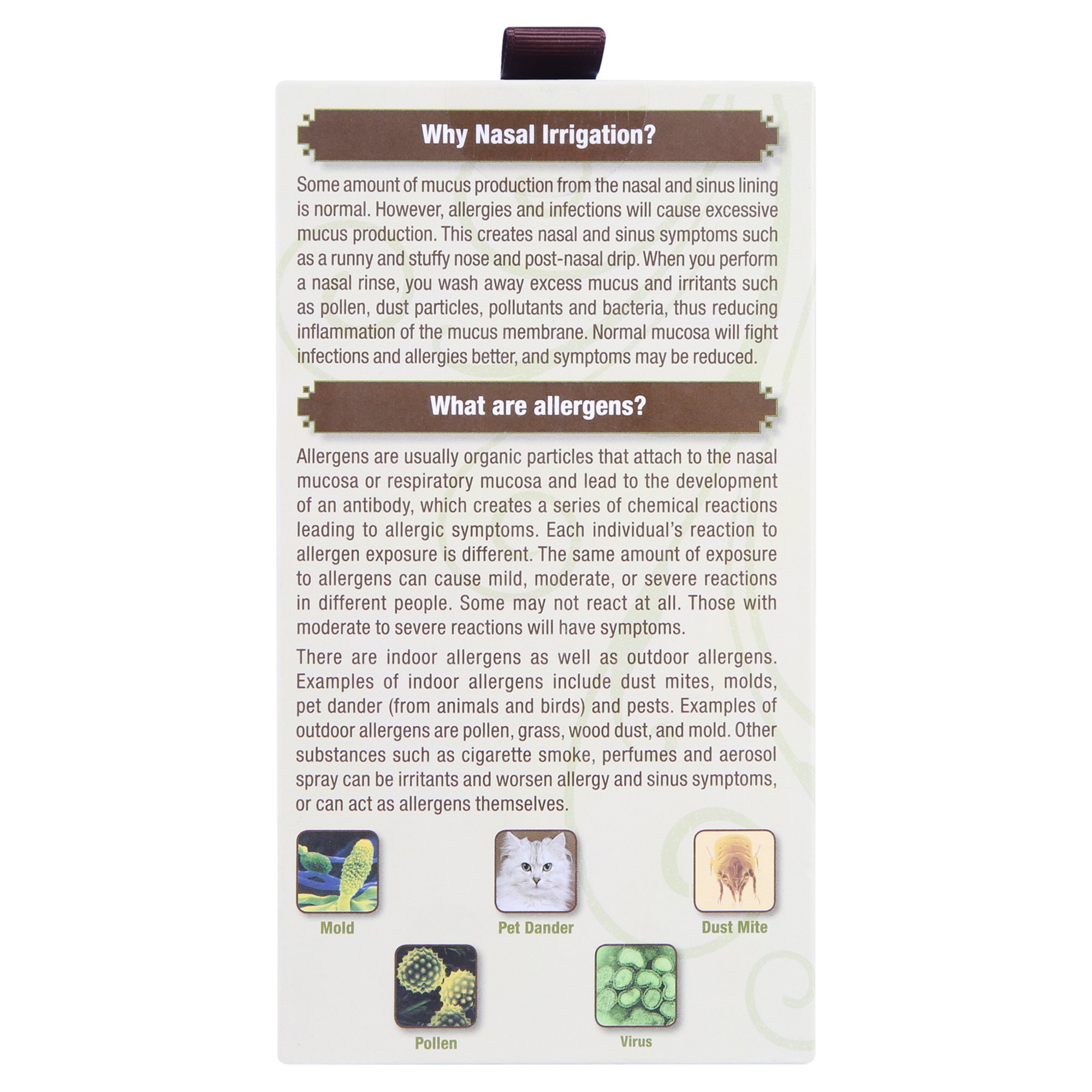 NasaFlo® Neti Pot is an all naturalm soothing saline nasal wash. Neti pots have been around for thousands of years, used often by yoga enthusiasts. Our 8 oz classically designed porcelain neti pot features an easy flow, no spill design for a soothing nasal rinse. Includes 30 premixed packets of all natural, USP Grade (Purity level 99% or higher) Sodium Chloride & Sodium Bicarbonate mixture.