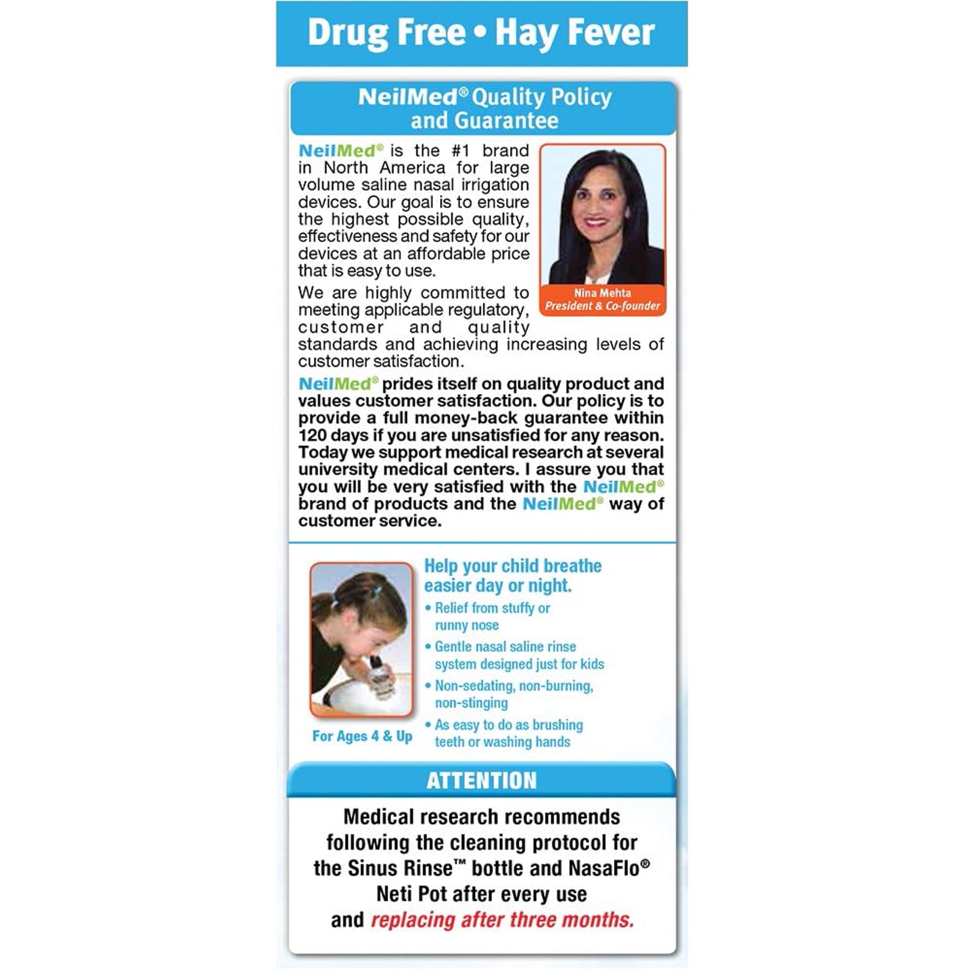 NeilMed SINUS RINSETM is an easy squeeze bottle system that allows you to deliver the saline solution with positive pressure to clean the nasal passages thoroughly, while maintaining your head in an upright position. You have complete control of the pressure and volume of solution, ensuring a gentle, soothing and therapeutic experience. Daily rinsing is safe and will keep your nasal passages clean, healthy and open.
