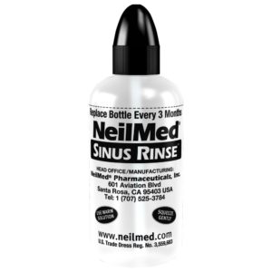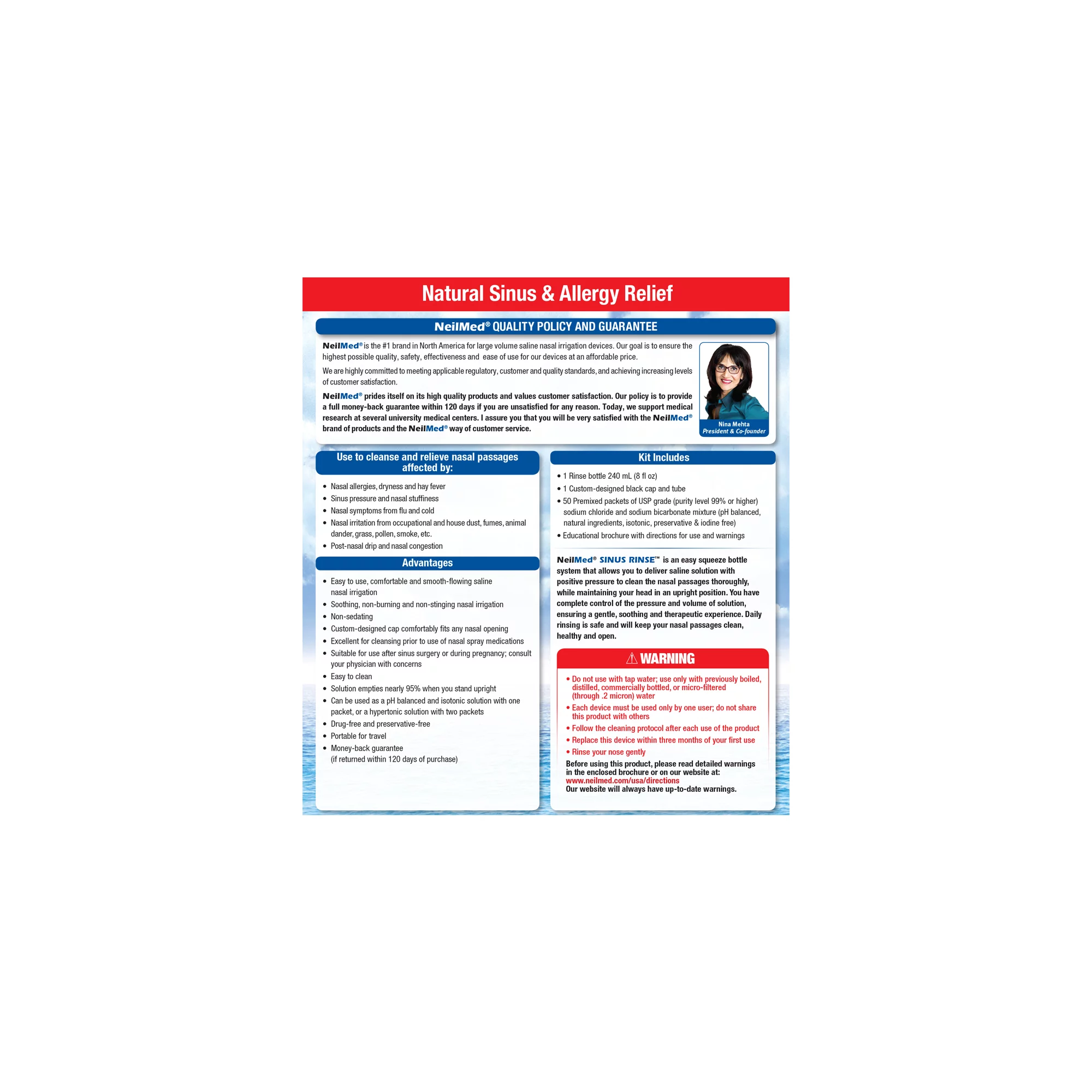 NeilMed Sinus Rinse. This product is use to cleanse and relieve nasal passages affected by nasal allergies, dryness and hay fever, sinus pressure and nasal stuffiness, nasal symptoms from flu and cold and nasal irritation from occupational and house dust, fumes, animal dander, grass, pollen, smoke, etc. It has custom-designed cap that comfortably fits any nasal opening. It is excellent for cleansing prior to use of nasal spray medications. It is suitable for use after sinus surgery or during pregnancy; consult your physician with concerns and can be used as a pH balanced and isotonic solution with one packet, or a hypertonic solution with two packets. This product is drug-free and preservative-free. The easy squeeze bottle system allows you to deliver saline solution with positive pressure to clean the nasal passages thoroughly, while maintaining your head in an upright position. You have complete control of the pressure and volume of solution, ensuring a gentle, soothing and therapeutic experience. Daily rinsing is safe and will keep your nasal passages clean, healthy and open.