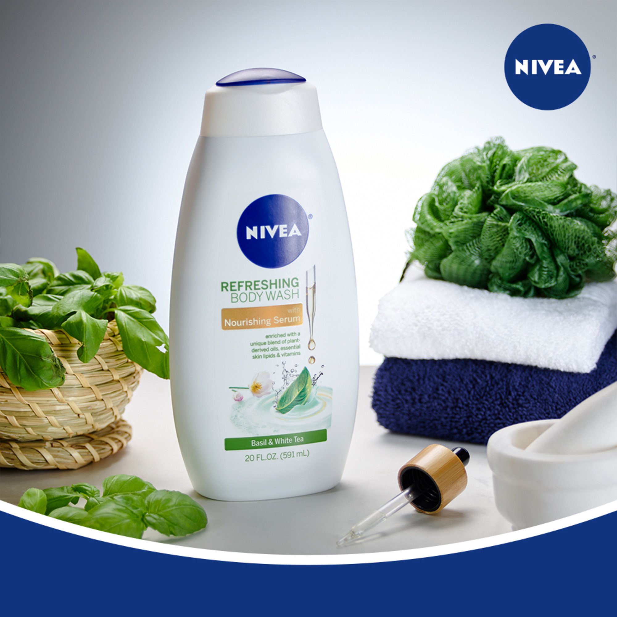 - One 20 fluid ounce bottle of NIVEA Basil and White Tea Body Wash with Nourishing Serum