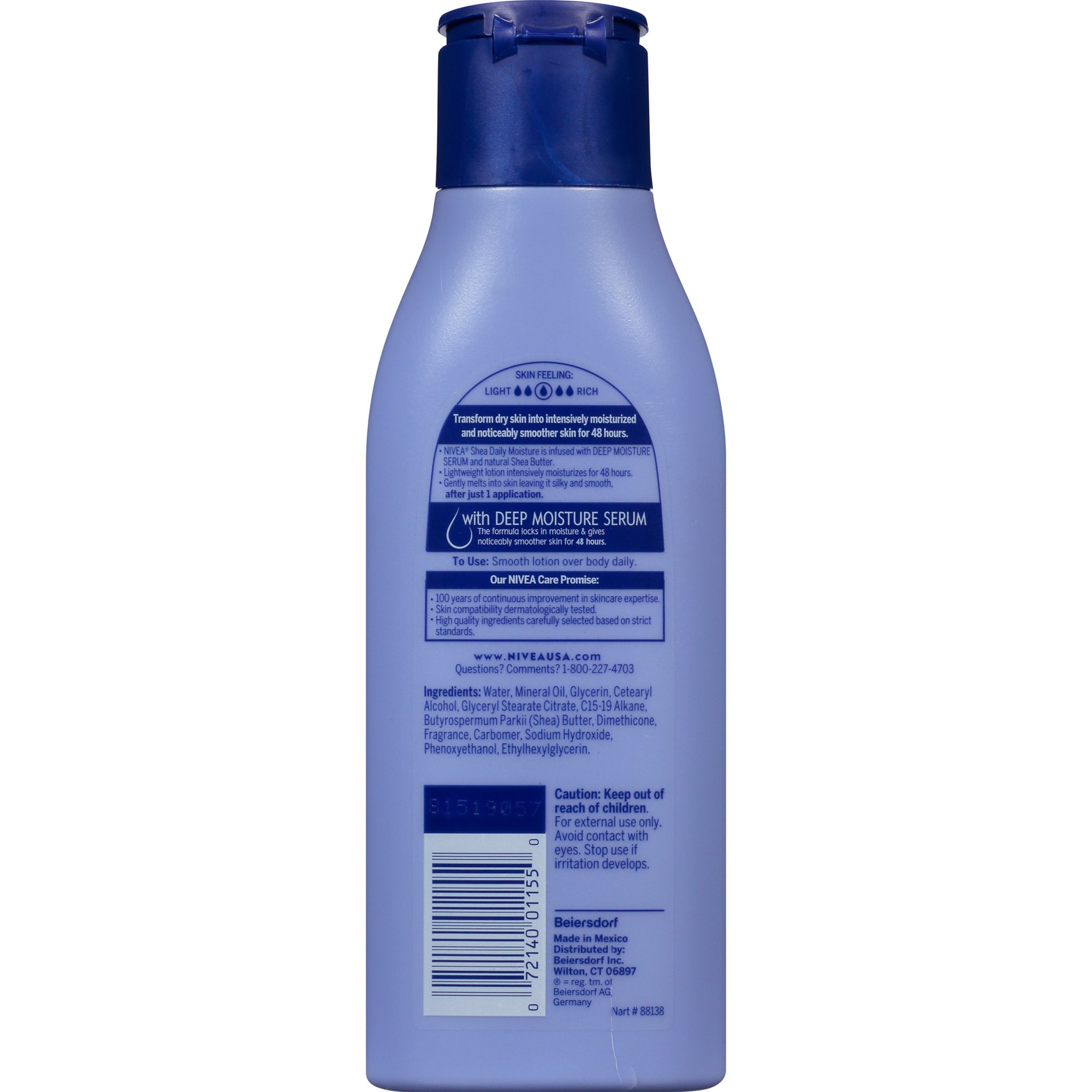 - This NIVEA body lotion is enriched with Shea Butter and Deep Nourishing Serum and locks in moisture giving noticeably smoother skin for 48 hours