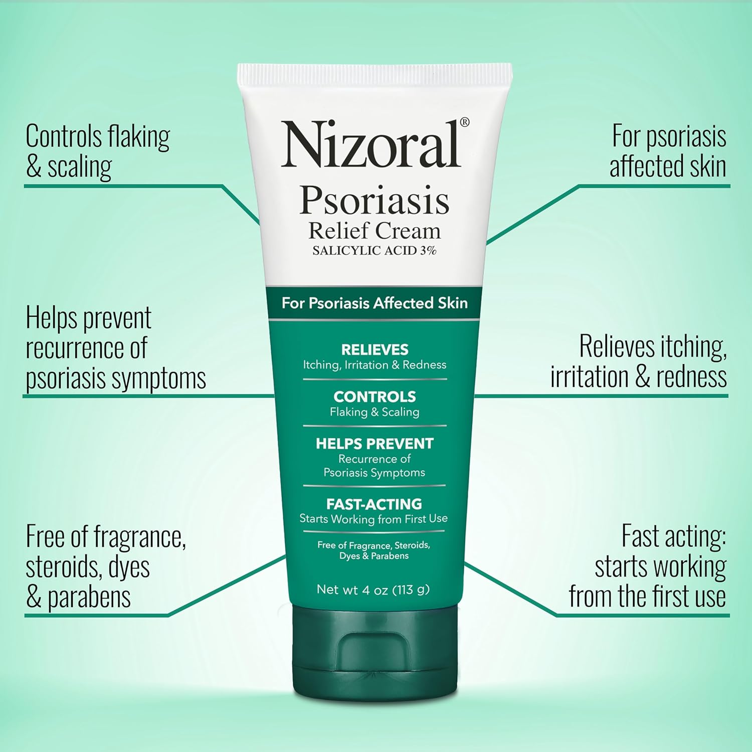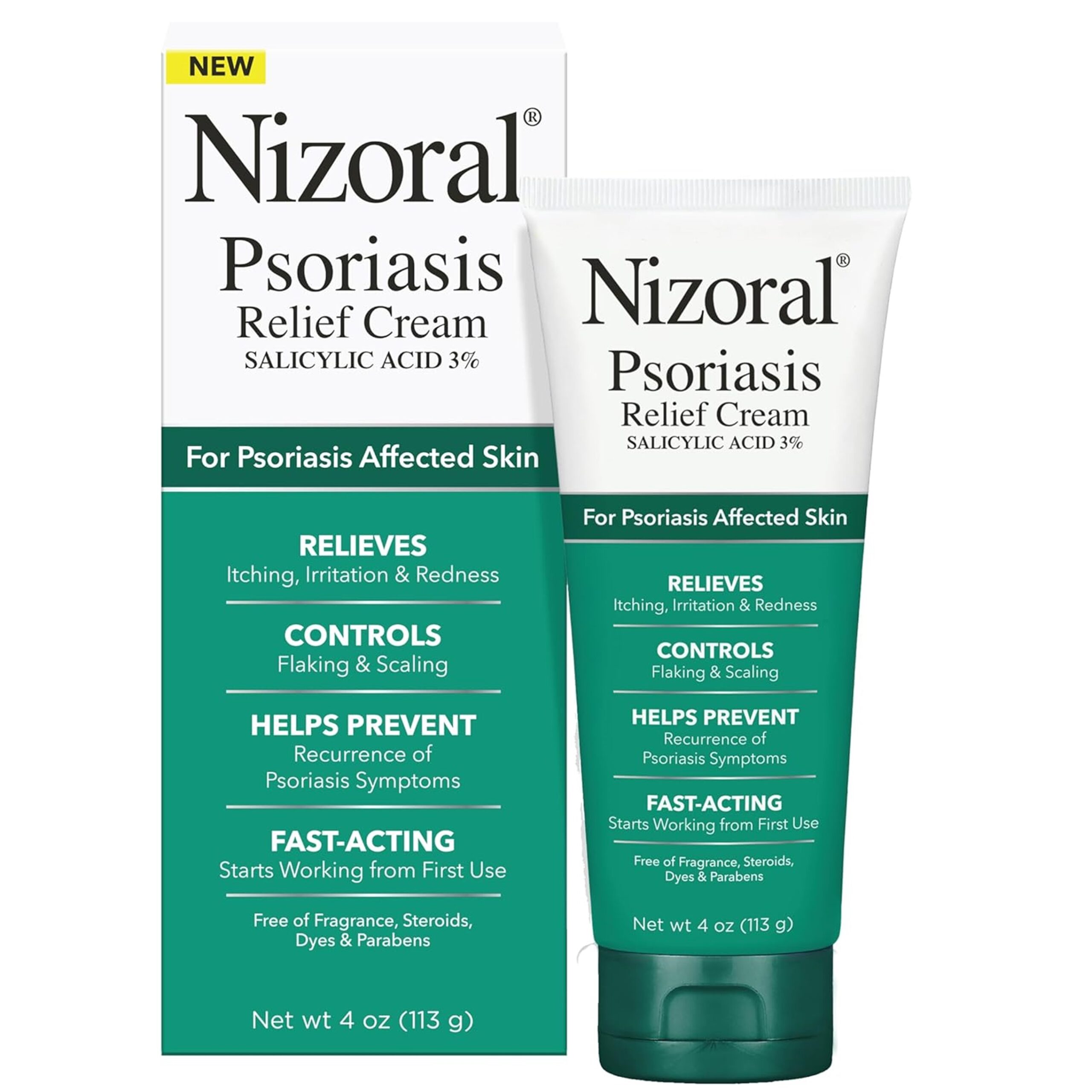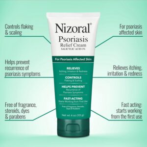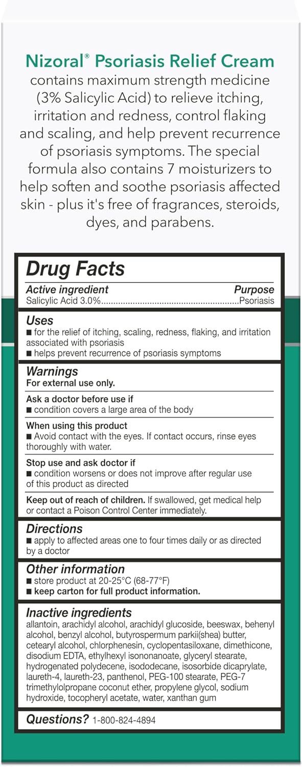 Nizoral Psoriasis Relief Cream contains maximum strength medicine (3% Salicylic Acid) to relieve itching, irritation and redness, control flaking and scaling, and help prevent recurrence of psoriasis symptoms.