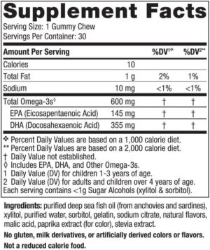 WHY OMEGA-3S – Omega-3 EPA & DHA support healthy brain & nervous system development, learning, and immune function. These yummy omega-3 fish oil gummies are for kids ages 3+.
