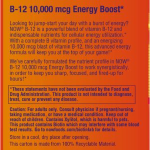 - ENERGY BOOST*/PROVIDES A FULL SPECTRUM OF B-VITAMINS: NOW B-12 is a powerful blend of vitamin B-12 and indispensable nutrients for cellular energy utilization.* With a complete B Vitamin profile and an energizing 10,000 mcg blast of Vitamin B-12, this advanced energy formula will keep you at the top of your game!*