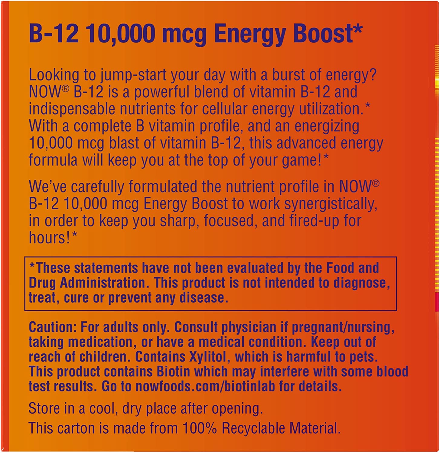Looking to jump-start your day with a burst of natural energy? NOW B-12 is a powerful blend of vitamin B-12 and indispensable nutrients for cellular energy utilization.* With a complete B Vitamin profile and an energizing 10,000 mcg blast of Vitamin B-12, this advanced energy formula will keep you at the top of your game!* We’ve carefully formulated the nutrient profile in NOW B-12 10,000 mcg Energy Boost to work synergistically, in order to keep you sharp, focused, and naturally fired-up for hours!*