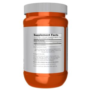 Mix 1 1/2 level teaspoons in fruit juice or other sweetened liquid 3 to 4 times daily, before and after exercise, for the first 7 days. Thereafter, for maintenance use, consume 1 to 3 times daily. Allow 3 to 4 hours between doses. For continuous use beyond 28 days, use one serving daily. Consume plenty of fluids with this product. Creatine is a compound that occurs naturally in the body, primarily in skeletal muscle. Creatine’s function is to serve as a precursor to adenosine triphosphate (ATP), the form of chemical energy used by all cells.* Body stores of creatine create a pool of readily available ATP for energy, which is necessary for fueling quick bursts of power and strength.* Studies have demonstrated that creatine supplementation can help to maintain existing muscle tissue, support the growth and development of lean mass, and promote optimal performance during short bouts of intense exercise.* NOW® Micronized Creatine Monohydrate is a pure powder that mixes easily and has no additives or preservatives.