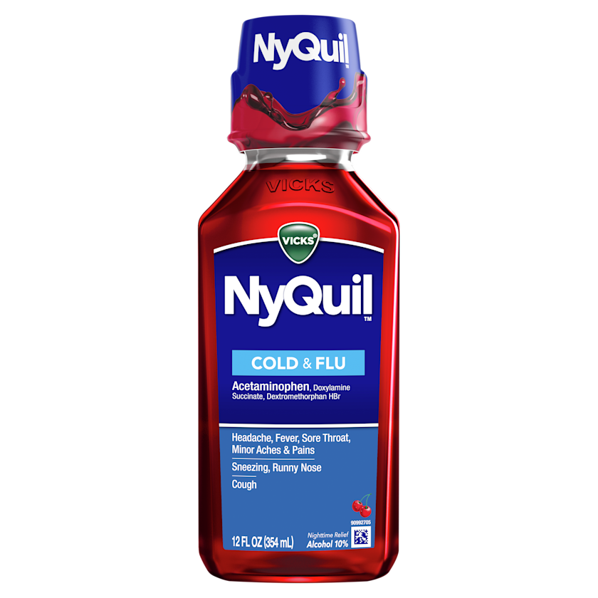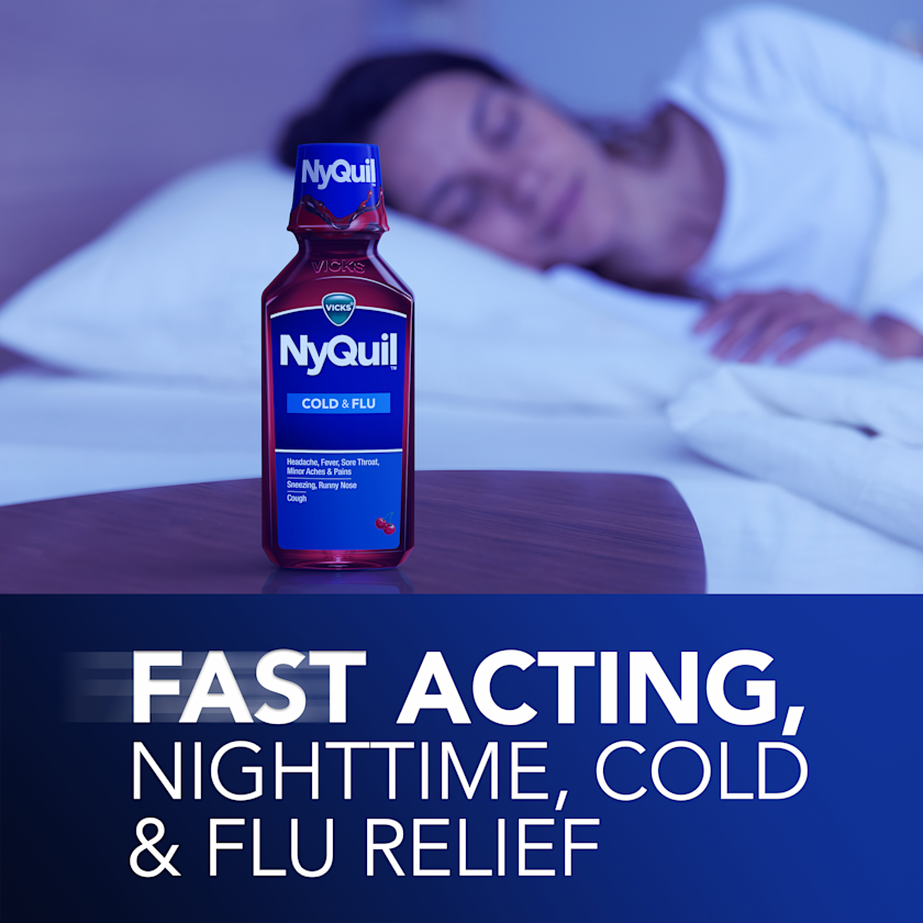 Vicks NyQuil Cold & Flu Liquid provides fast, powerful relief for your worst cold and flu symptoms. When cold symptoms keep you up, turn to Vicks NyQuil Cold & Flu nighttime relief medicine to help you get the rest you need. When you need fast relief, this powerful, multi-symptom relief medicine treats headache, fever, sore throat, minor aches and pains, sneezing, runny nose, and cough due to minor throat and bronchial irritation. Nothing works faster. Get the NyQuil you trust in a great-tasting Cherry flavor. Vicks NyQuil is the #1 pharmacist recommended nighttime cough, cold & flu brand*Take only as directed