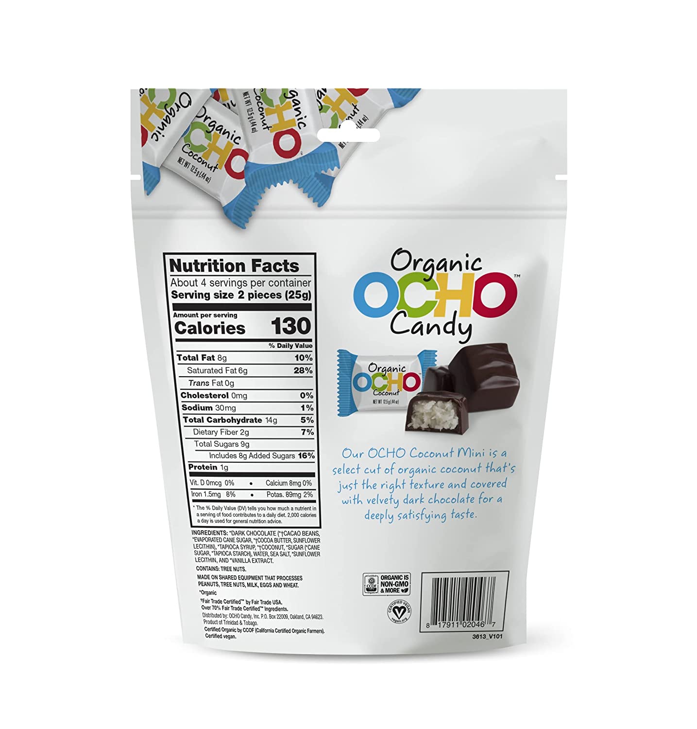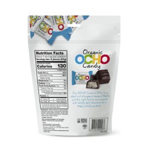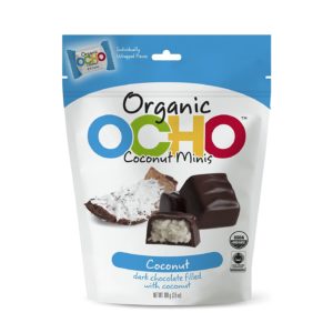 Mini OCHO Organic Candy Bars – Dark Chocolate Coconut have a sweet, creamy organic coconut center, covered in rich organic dark chocolate. OCHO Candy Bars are USDA Certified Organic and Fair Trade Certified. Plus, they’re always made with 100% natural and non-GMO ingredients, and they’re vegetarian. Have an OCHO and enjoy your day!