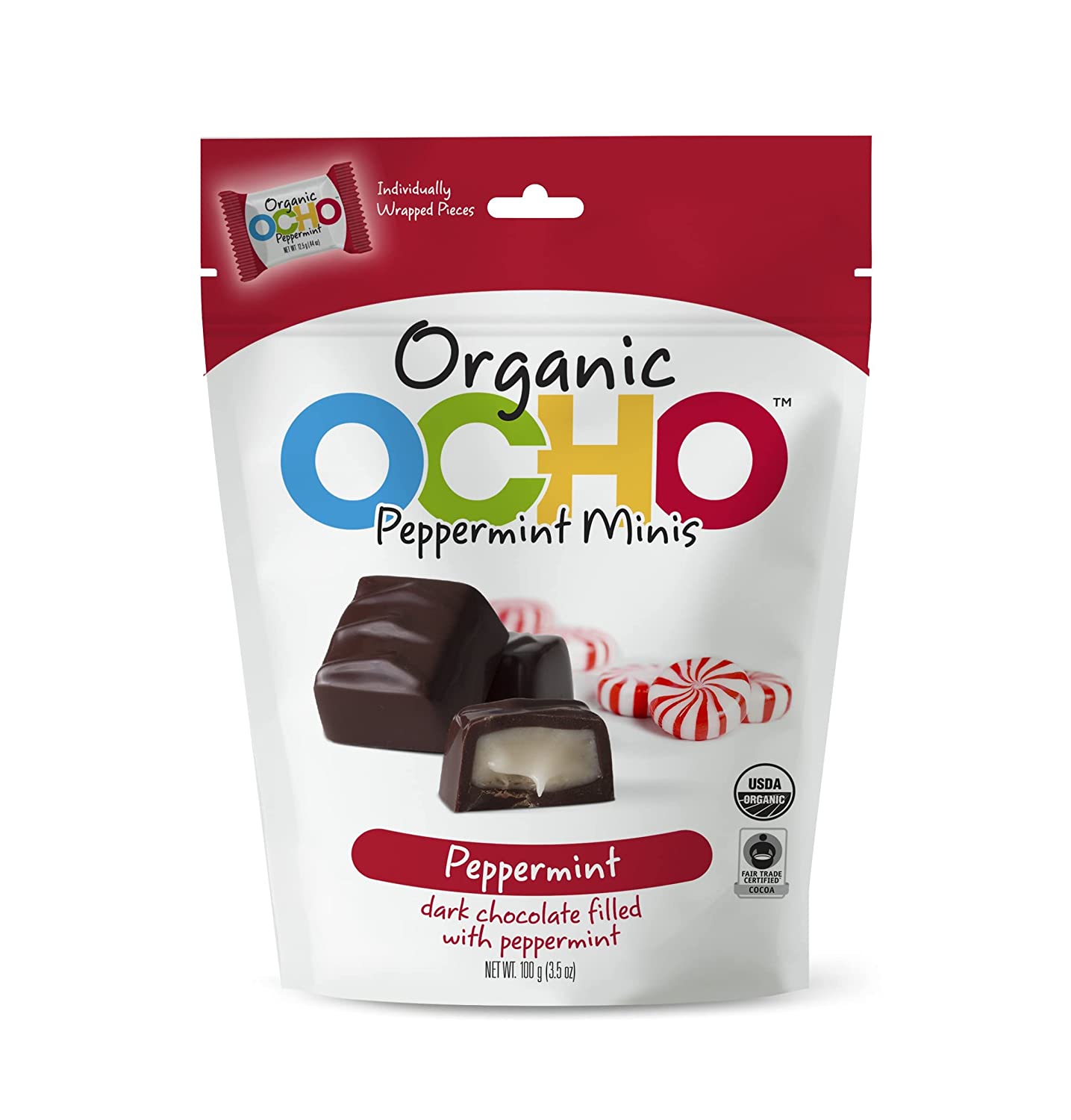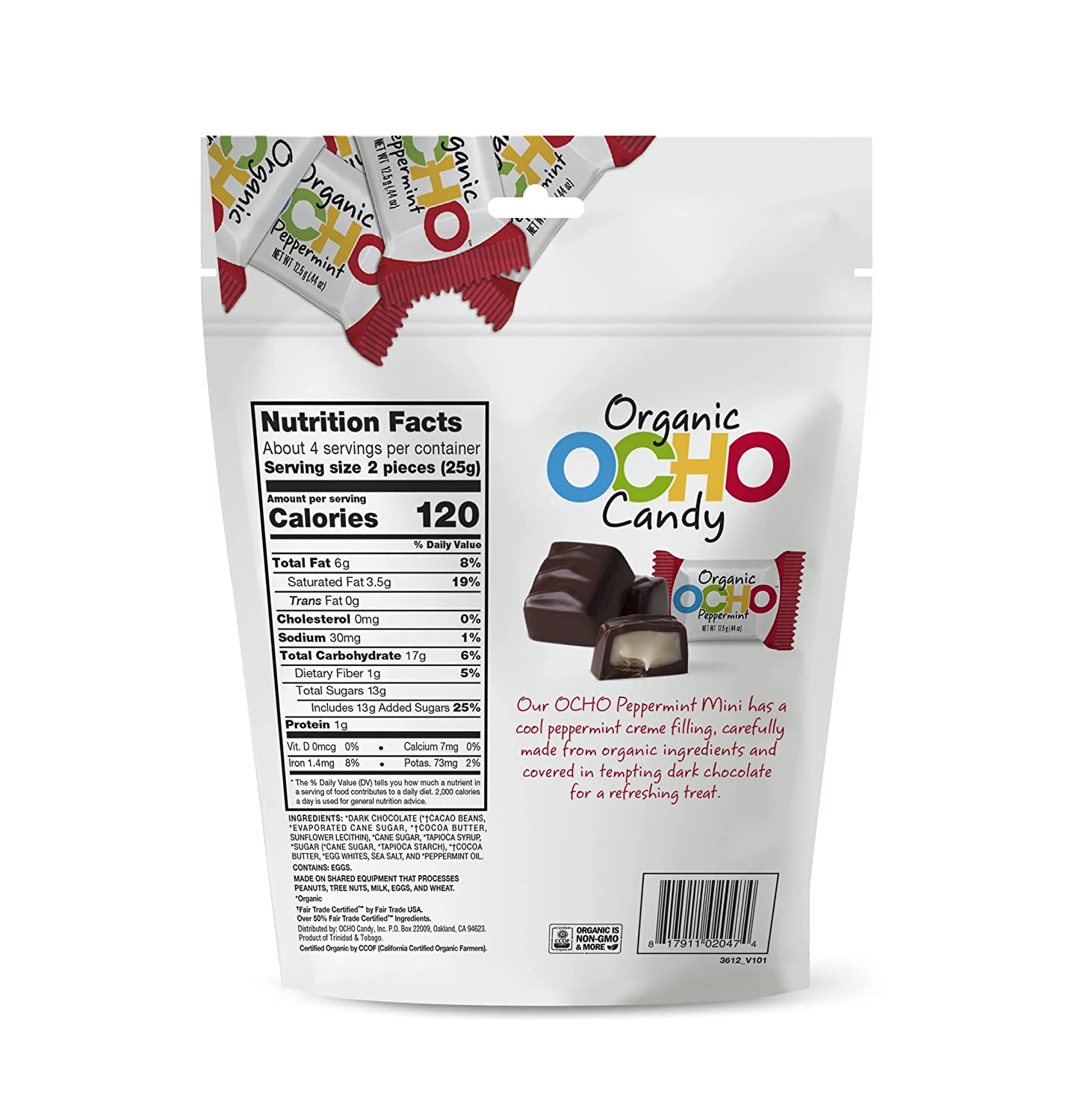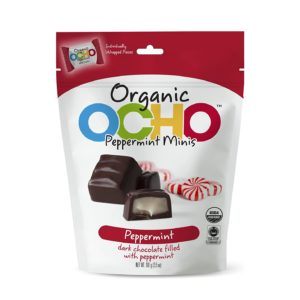 Mini OCHO Organic Candy Bars – Dark Chocolate Peppermint have a cool peppermint crème filling, carefully made from organic ingredients and covered in tempting dark chocolate for a refreshing treat. OCHO Candy Bars are USDA Certified Organic and Fair Trade Certified. Plus, they’re always made with 100% natural and non-GMO ingredients, and they’re vegetarian. Have an OCHO and enjoy your day!