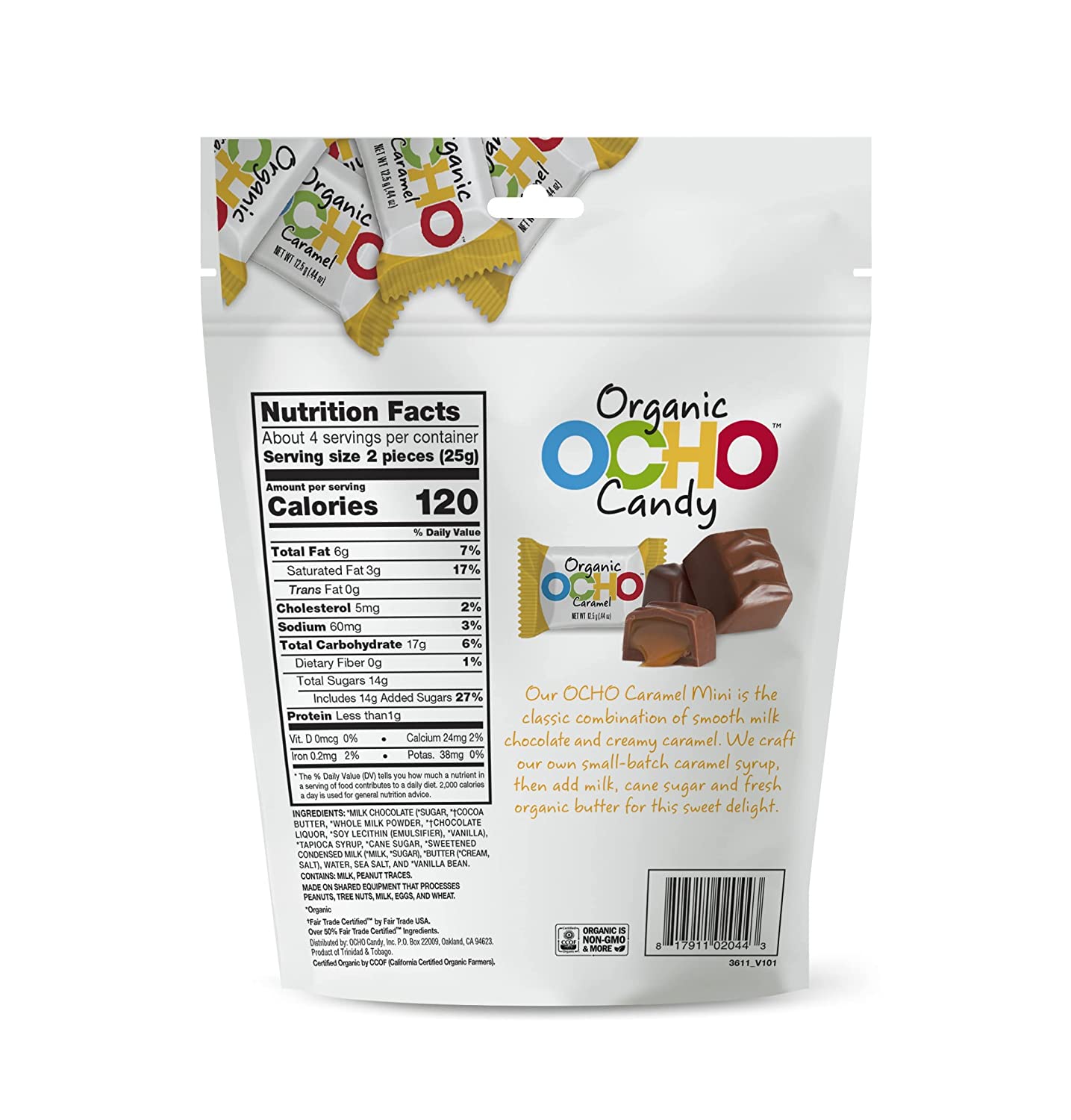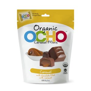 Luscious caramel in mouthwatering milk chocolate. Mini OCHO Organic Candy Bars – Milk Chocolate Caramel have a classic smooth caramel center covered in milk chocolate for a delicious treat you can’t resist. OCHO Candy Bars are USDA Certified Organic and Fair Trade Certified. Plus, they’re always made with 100% natural and non-GMO ingredients, and they’re vegetarian. Have an OCHO and enjoy your day!