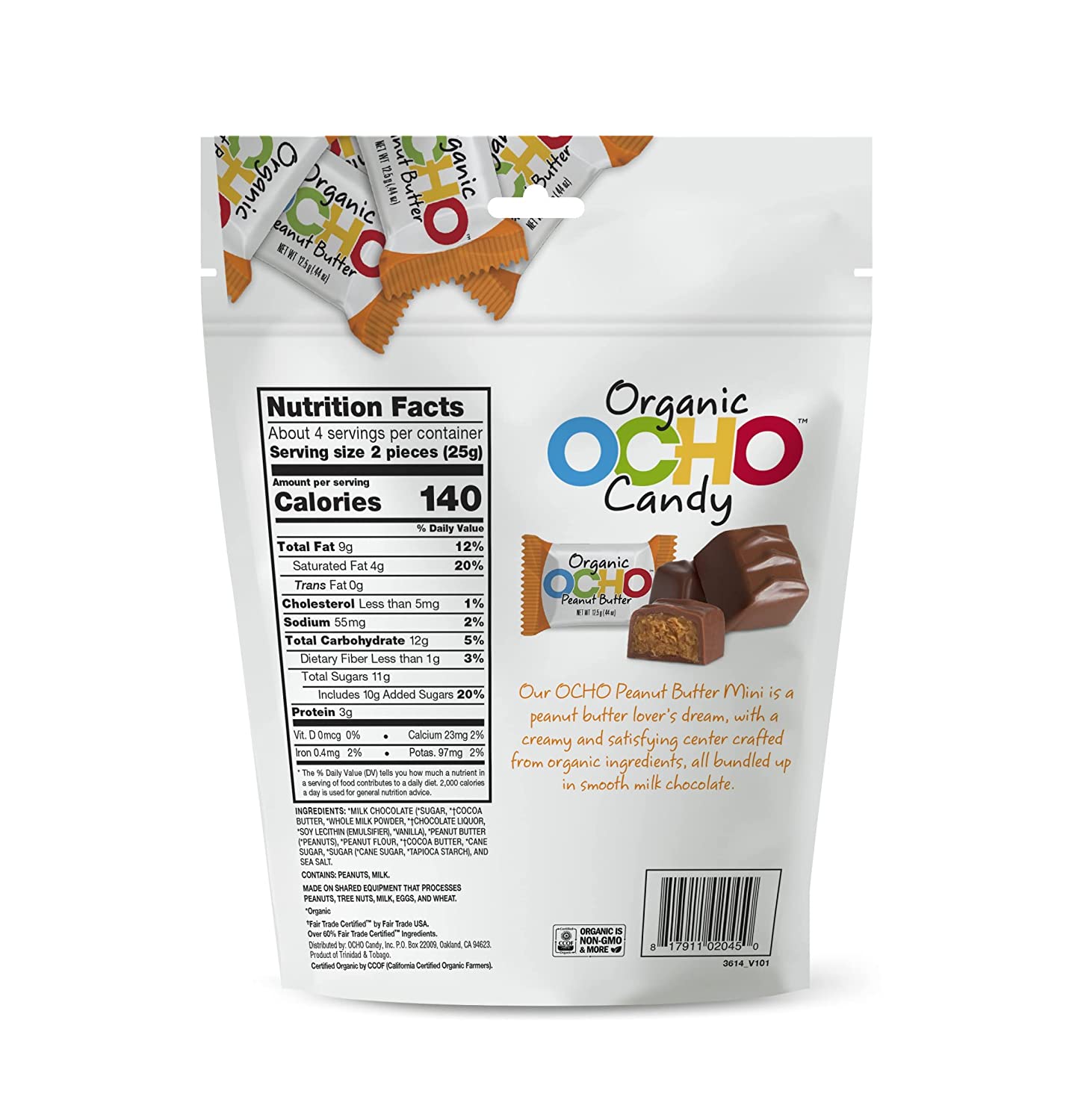 A crisp Milk Chocolate shell covers creamy and crunchy peanut butter (yes, both creamy and crunchy! It’s a dream…) OCHO Organic Candy Bar – Milk Chocolate Peanut Butter is made with 100% USDA Certified Organic ingredients. Plus, it’s non-GMO, vegetarian, and Fair Trade Certified! Have an OCHO bar and enjoy your day!