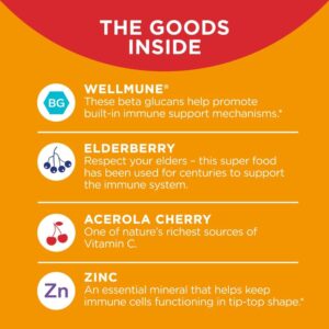 WELLMUNE*: These beta glucans support immune health by helping to promote built-in cellular defense mechanisms.* ACEROLA CHERRY: One of nature’s richest sources of Vitamin C. ELDERBERRY: Respect your elders – this super food has been used for centuries to support the immune system. ZINC: An essential mineral that helps keep immune cells functioning in tip-top shape.*