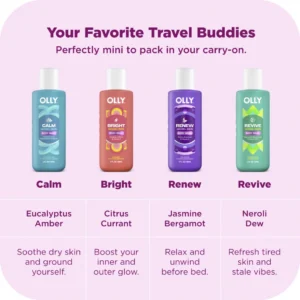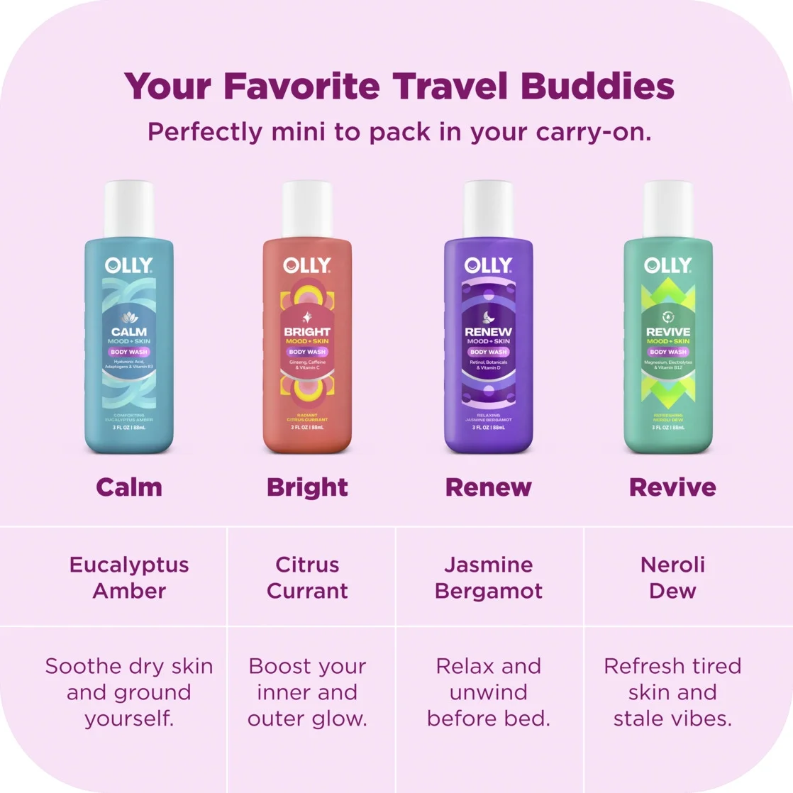 No two days are the same—why should your body wash be? Enjoy all four of our Mood + Skin body washes, made mini. Soothe yourself with CALM. Nourish skin with OLLY Vitamin Complex, featuring hyaluronic acid, adaptogens, and vitamin B3, and quiet your mood with the grounding scent of Comforting Eucalyptus Amber. Say “peace out” to dull skin and mood with BRIGHT. Boost your skin’s glow with OLLY Vitamin Complex, featuring ginseng, caffeine, and vitamin C, and feel awake and invigorated with the energizing scent of Radiant Citrus Currant. Get ready for bed with RENEW. Repair skin overnight with OLLY Vitamin Complex, featuring retinol, botanicals and vitamin D, and let the dreamy scent of Relaxing Jasmine Bergamot help you drift-off. Recharge your skin and mood with REVIVE. Fast-track skin’s recovery with OLLY Vitamin Complex featuring magnesium, electrolytes, and vitamin B12 and feel replenished with the rejuvenating scent of Refreshing Neroli Dew. Skin-repairing, mood-morphing, and totally OLLY—this is your daily routine, bottled.