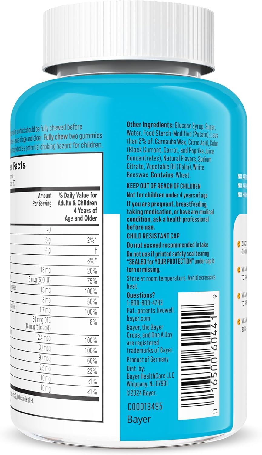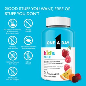 Support your little ones’ overall health* with One A Day Kids Multivitamin, a tasty gummy vitamin for kids that supports healthy development and immune health* for kids ages 4+. Your kids will love the natural orange, raspberry and cherry flavor with other natural flavors —and you’ll love that they are free of artificial sweeteners, artificial flavors, high fructose corn syrup and egg, fish/crustacean shellfish, dairy (milk), soy and peanut and tree allergens. One A Day kids multivitamin gummies provides essential nutrients for healthy development, including Vitamin C for immune support, Vitamin D to support bone health, and B12 and B6 vitamins to support brain health.* So, try our vitamin gummies and give your kids key nutrients to help support brain health, bone health and immune health.* *This statement has not been evaluated by the Food and Drug Administration. This product is not intended to diagnose, treat, cure, or prevent any disease.