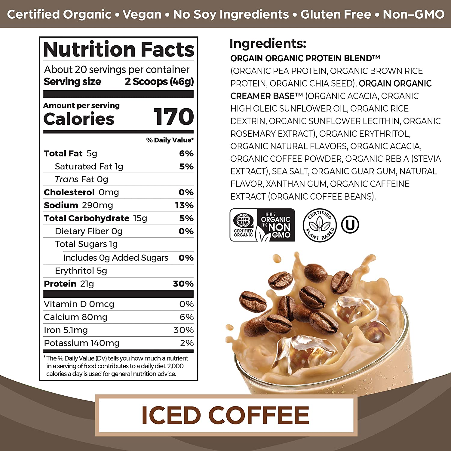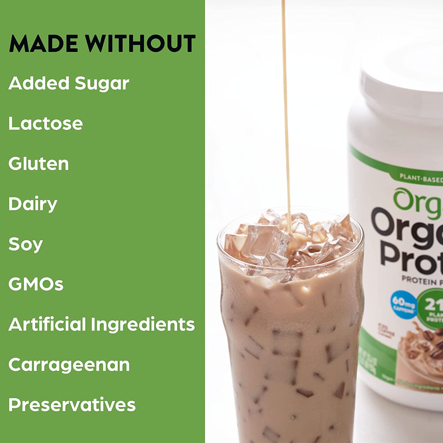 Orgain Organic Vegan Protein Powder, Iced Coffee, 21g of Plant Based Protein, 60mg of Caffeine, Low Net Carbs, Non Dairy, Gluten Free, No Sugar Added, Soy Free, Kosher, Non-GMO, Flavored, 2.03 Lb