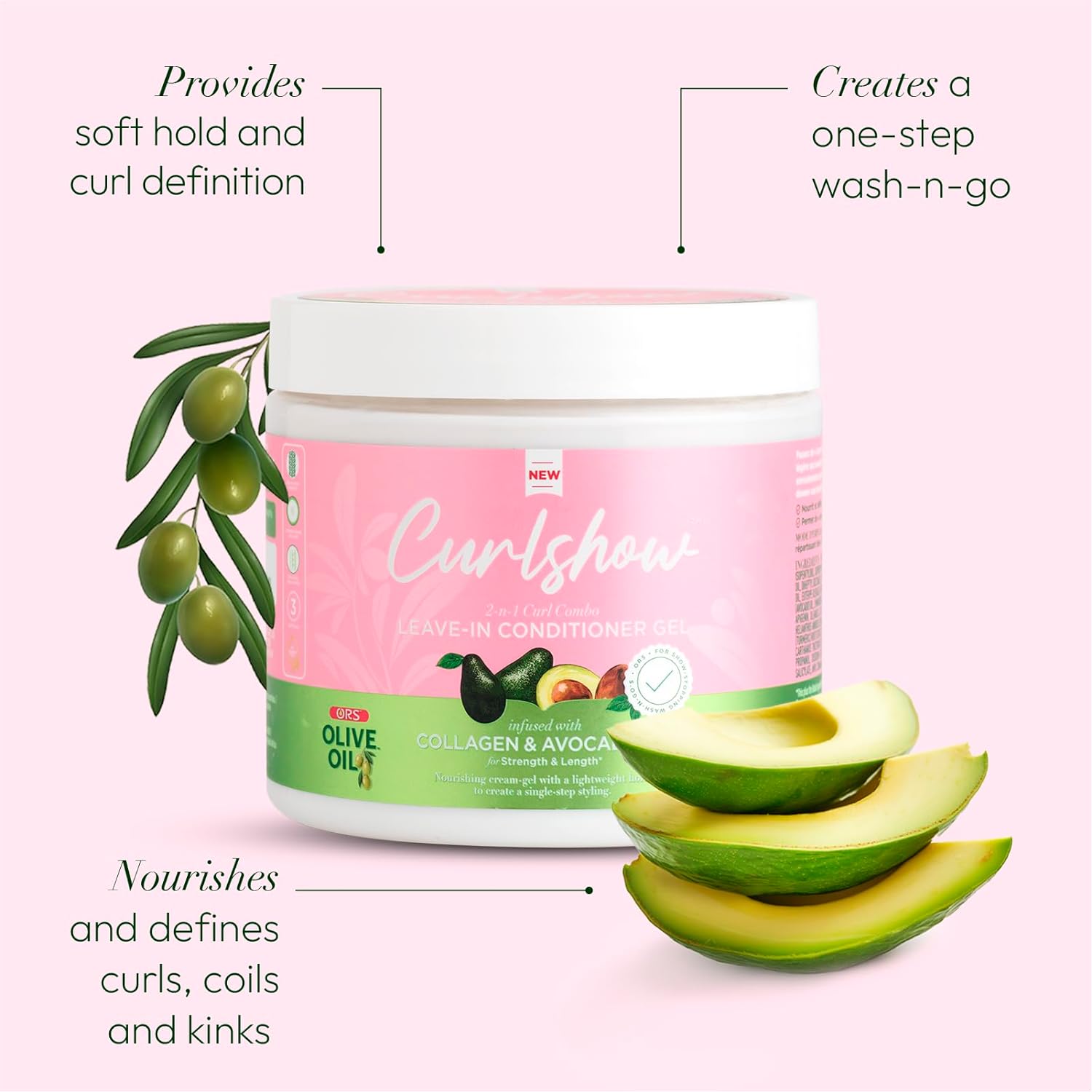 ORS Olive Oil Curlshow Leave-In Conditioner Gel Infused with Collagen & Avocado Oil for Strength & Length 16oz