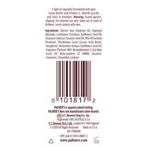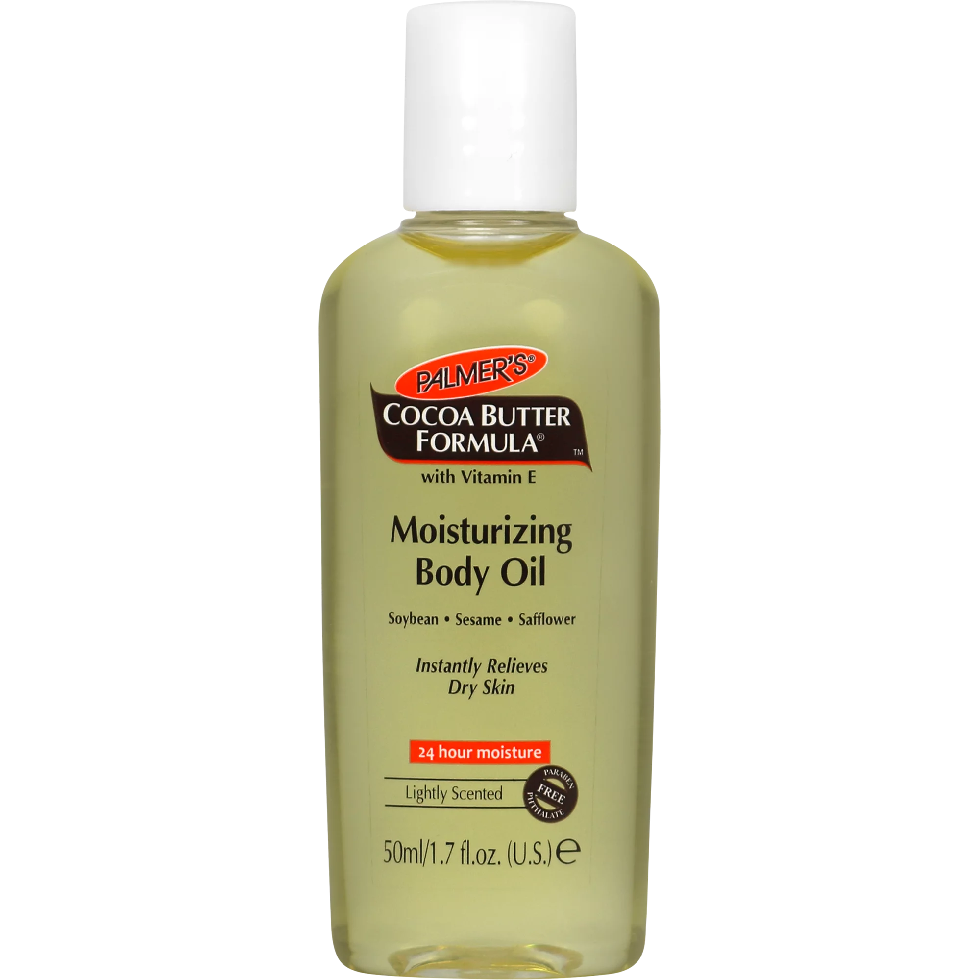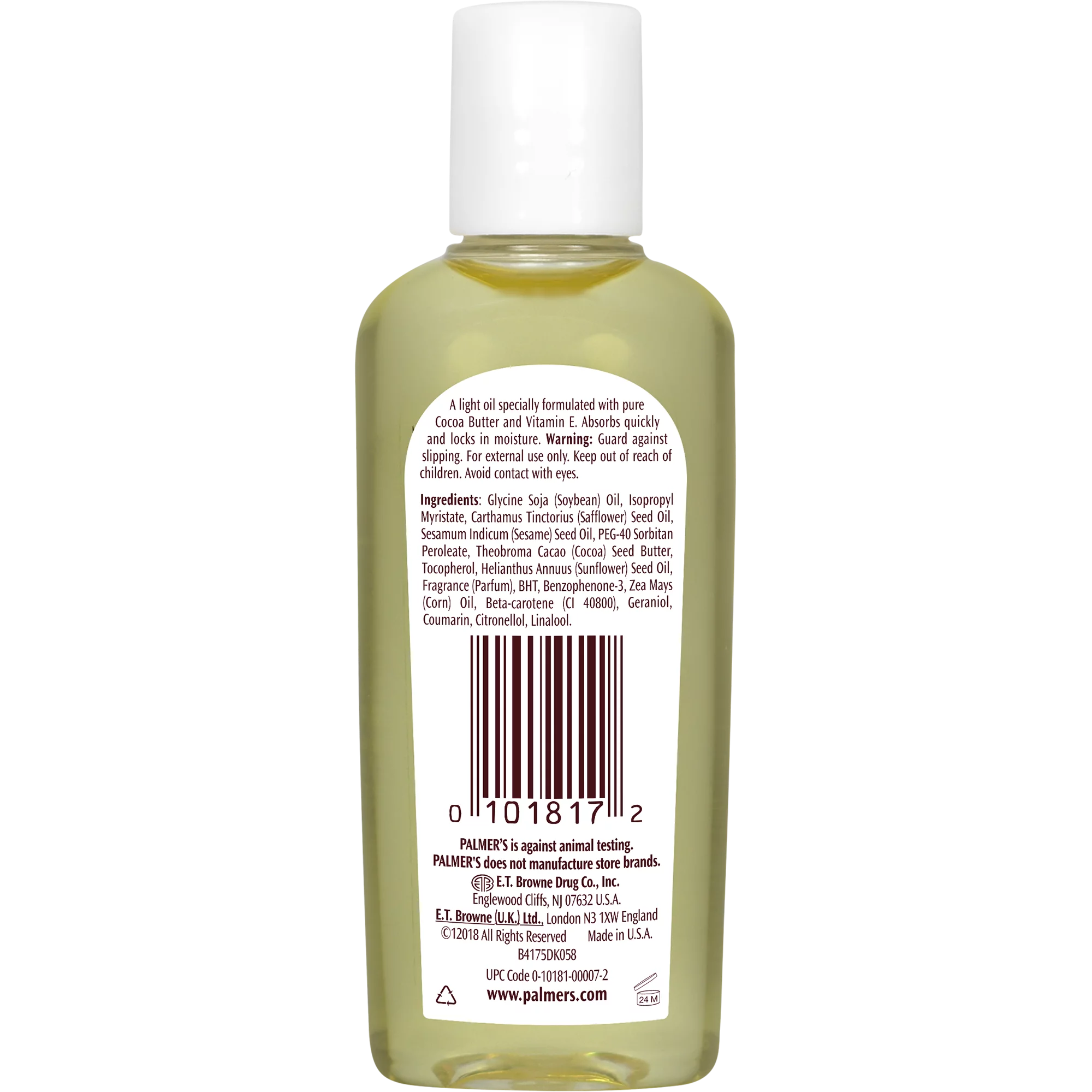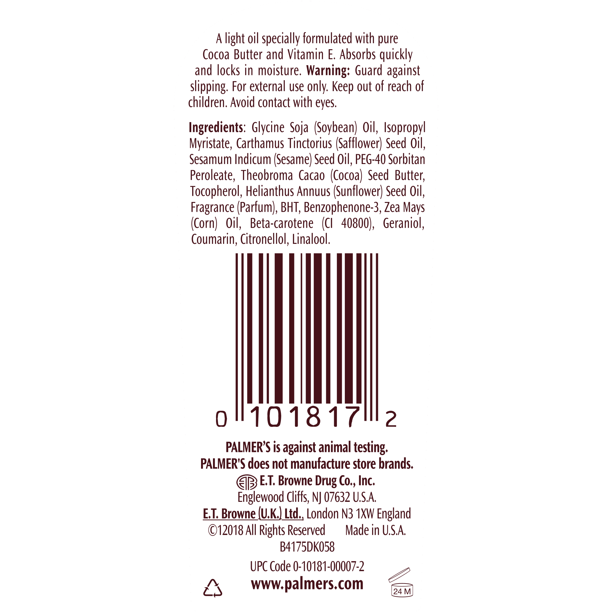 Palmer’s Cocoa Butter Formula Moisturizing Body Oil, enriched with Vitamin E, is a fast absorbing, lightly scented body oil that helps moisturize and soothe rough, dry skin without greasiness. May be applied after shower or bath or poured directly into the bath.