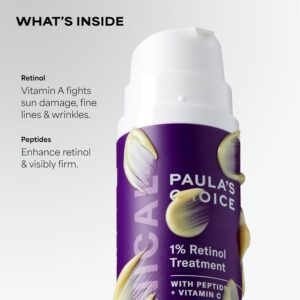 • TARGETED SOLUTION: Paula’s Choice CLINICAL 1% Retinol Treatment with Peptides & Vitamin C reduces the appearance of wrinkles, refines pores, firms skin & helps prevent signs of aging while softening post-acne marks for a radiant, youthful appearance.