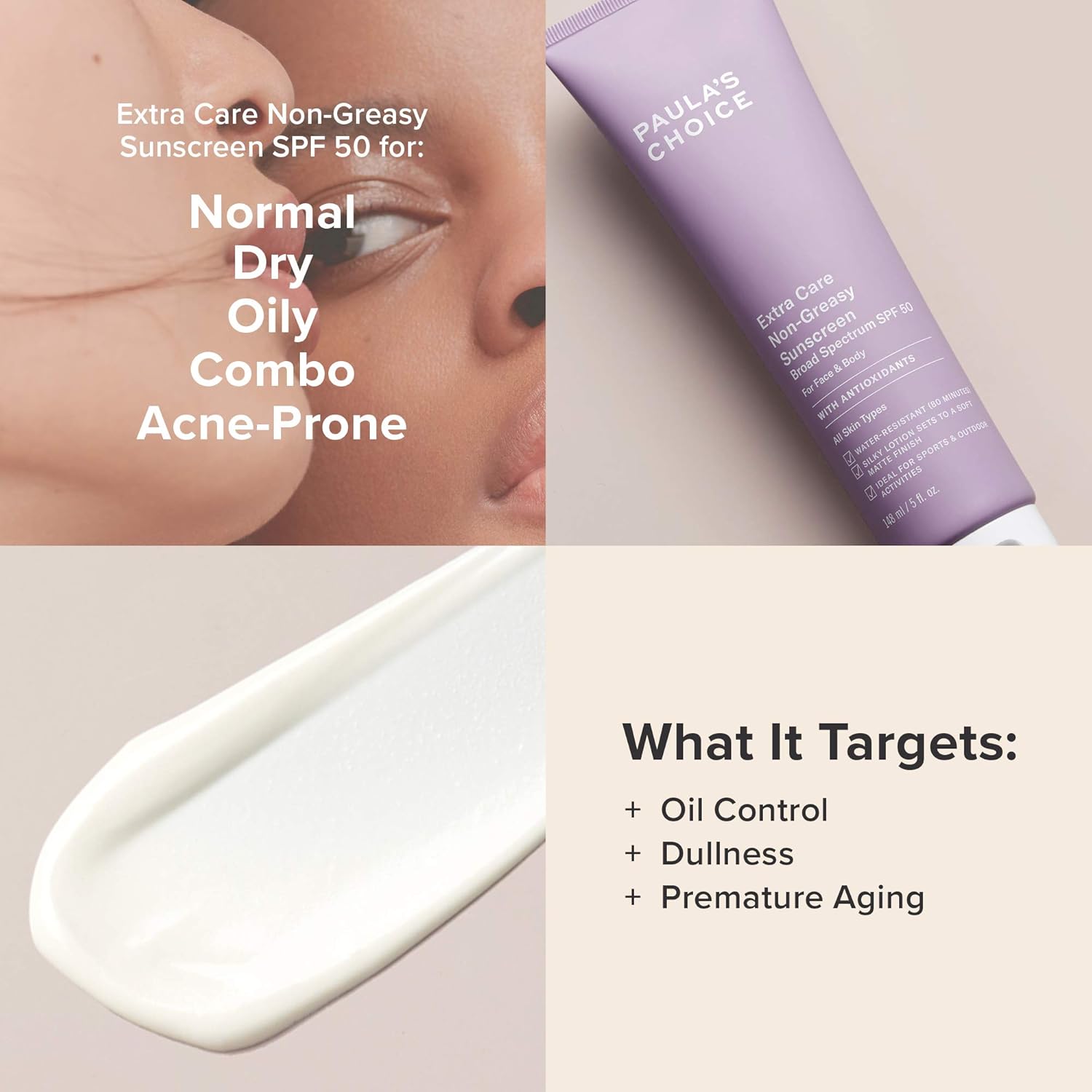 - Paula’s Choice Extra Care Non-Greasy Sunscreen is water- and sweat-resistant; ideal for outdoor & water-based activities. This silky oil-free formula is great for all skin types including oily and combination skin. Goes on smooth & dries to a soft matte finish.