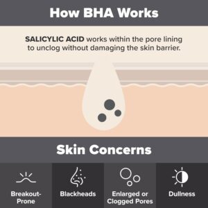 - Dramatically improves skin’s texture for radiant youthful even-toned skin. Beta hydroxy acid (BHA, also known as salicylic acid) mimics the natural exfoliation process of younger skin by helping it shed extra layers while unclogging and clearing pores.