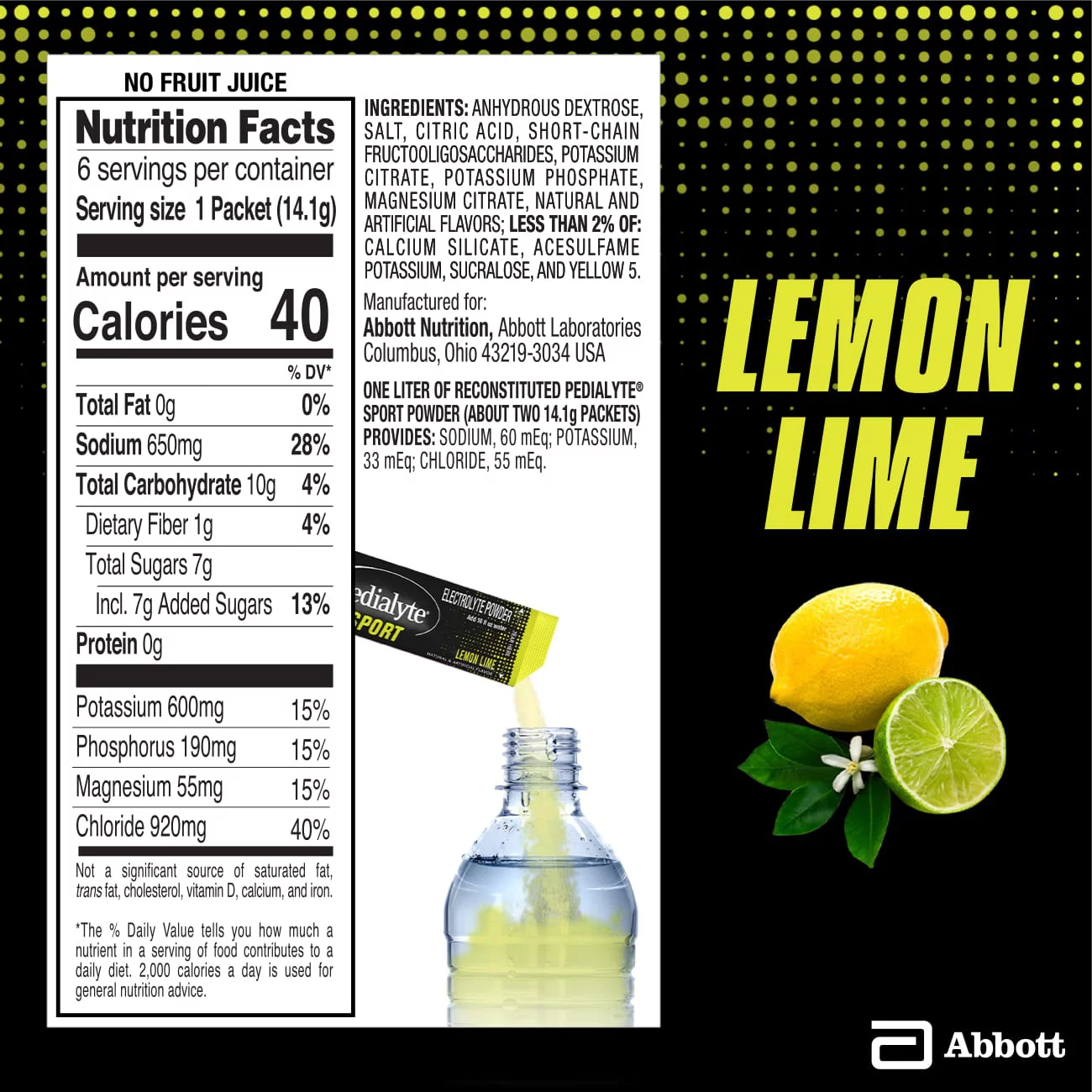 Pedialyte Sport has a scientifically designed balance of electrolytes and sugar, with 3x the electrolytes and ¼ the sugar of the leading sports drinks.* It’s formulated for athletes to provide fast hydration and muscle support before, during, and after exercise. And it has 5 key electrolytes that help replace what is lost in sweat during intense workouts: sodium (to avoid muscle cramping), chloride (for fluid balance), potassium (for muscle and nerve function), magnesium (for muscle health), and phosphate (for muscle repair). From the hydration brand that has been used by professional sports teams for decades, Pedialyte Sport is available in ready-to-drink liters and convenient powder packs that go anywhere you do. It comes in 2 great flavors: Fruit Punch and Lemon Lime.* Pedialyte Sport products have 1380mg sodium and no more than 14g sugar per liter; leading sports drinks have ≈460mg sodium and ≈58g sugar per liter.