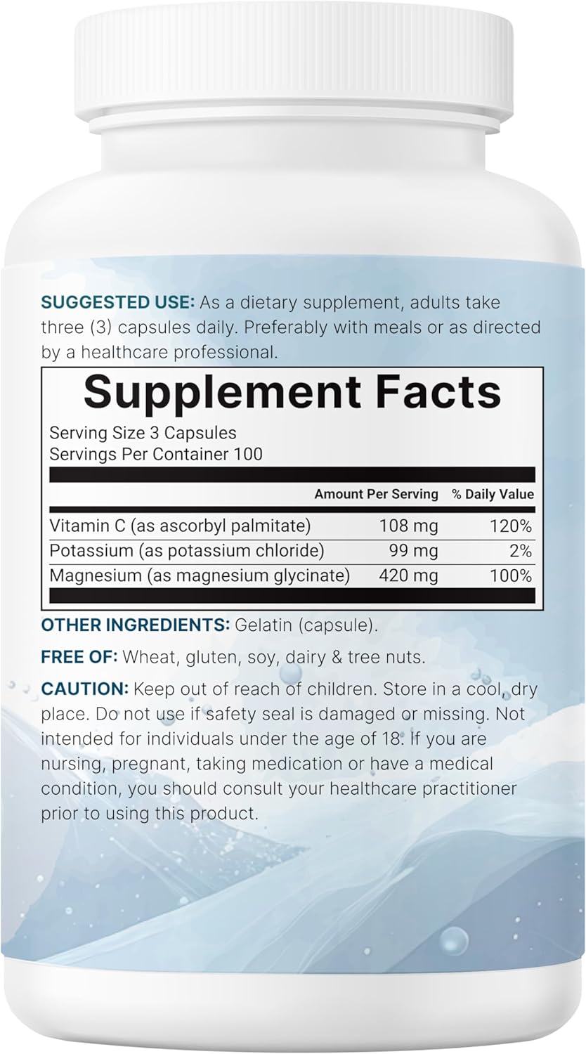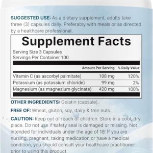 - Each bottle provides 300 capsules with 100 servings, delivering 99mg of potassium as potassium chloride, 420mg of magnesium as magnesium glycinate, and 90mg of vitamin C as ascorbyl palmitate.