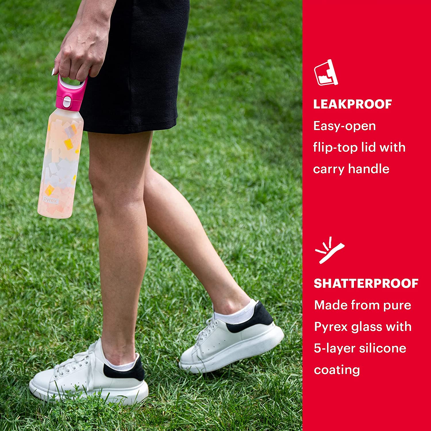 - REUSABLE & RELIABLE: The Pyrex 17.5-oz bottle is a hygienic glass bottle with shatterproof 5-layer silicone safety wall. The leakproof lock cap makes this reusable bottle perfect for your work bag, gym bag or for the kids to use to take to school.
