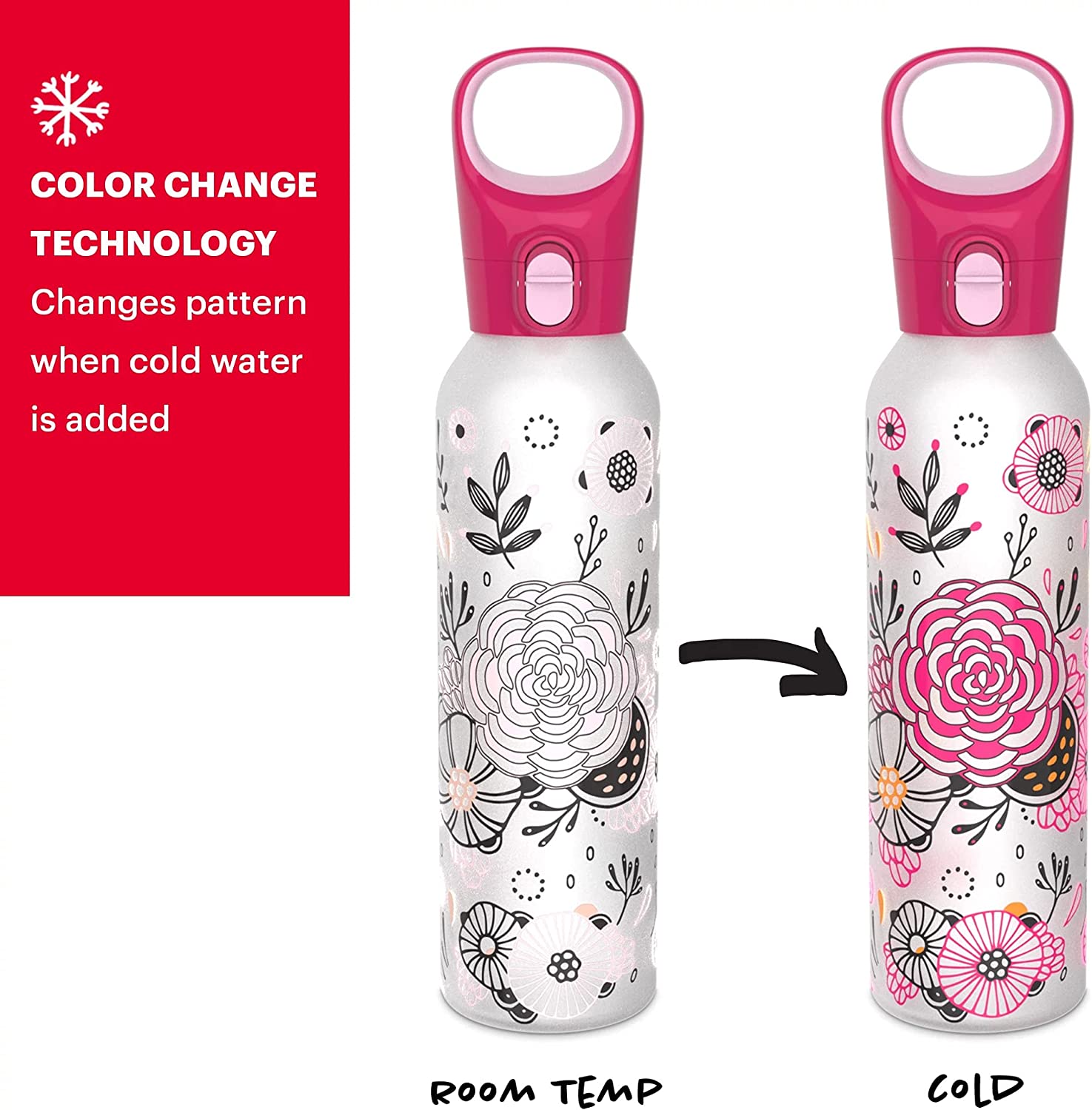 - COLOR-CHANGING: Style and technology blend seamlessly in this 17.5-oz water bottle. Fill it up with cold water and watch as the bottle comes to life with vibrant colors that will make your day.