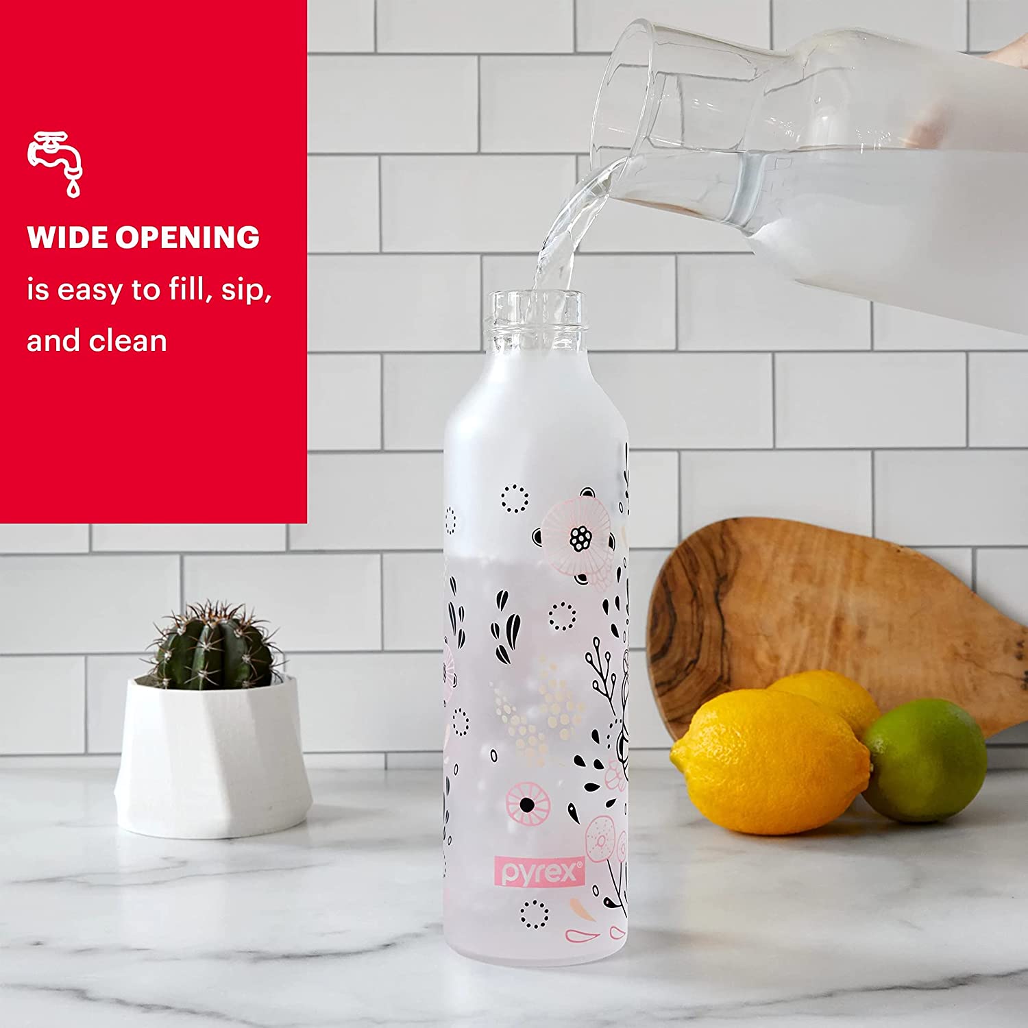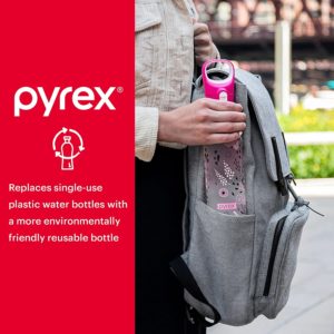 - HIGHLY FUNCTIONAL: The Pyrex reusable water bottle has a break resistant outer body and can be used for a variety of beverages including water, sports drinks, juice, or even tea and coffee. It is also easy to fill and clean, for quick refills.